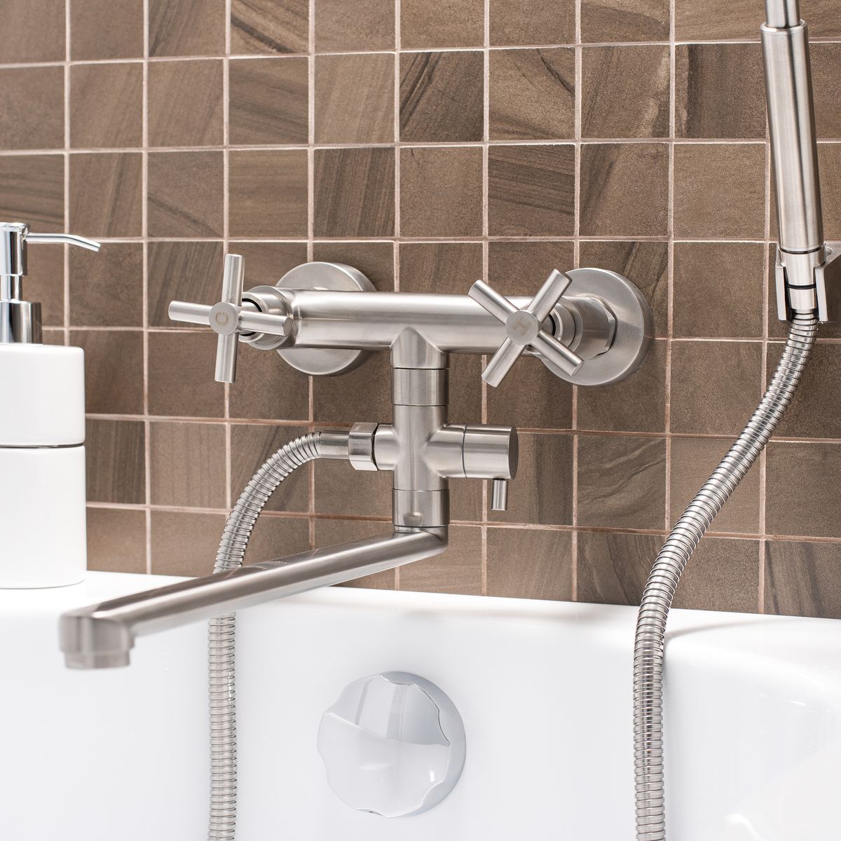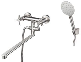 Оригинальный двуручковый смеситель для ванны с длинным поворотным изливом, функционально и эстетически дополнит ванную комнату.