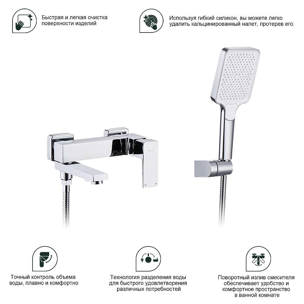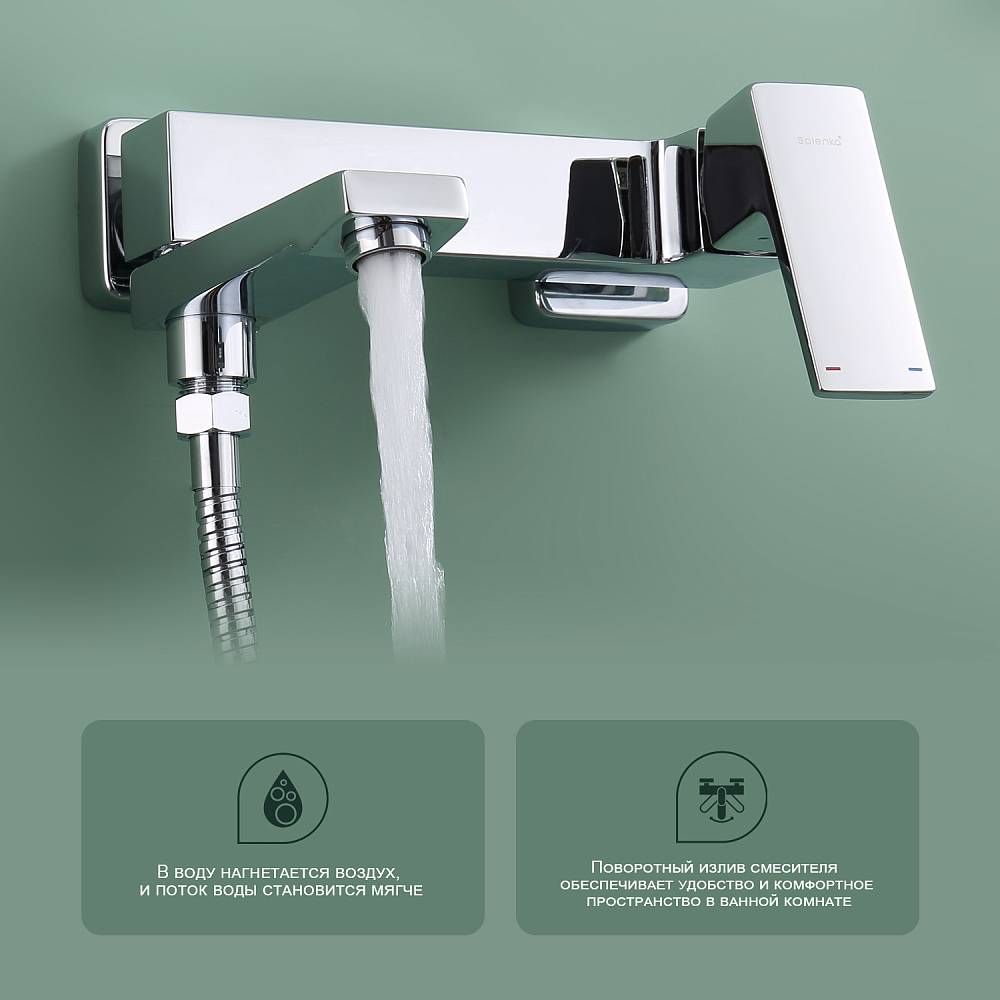 Смеситель для ванны Splenka S01.30. Цвет: хром. Материал: латунь. Управление: однорычажное. Механизм: керамический картридж. Излив: поворотный. Стандарт подводки: G 1/2. Аэратор. Монтаж: на стену. Душевая лейка - 3 режима.