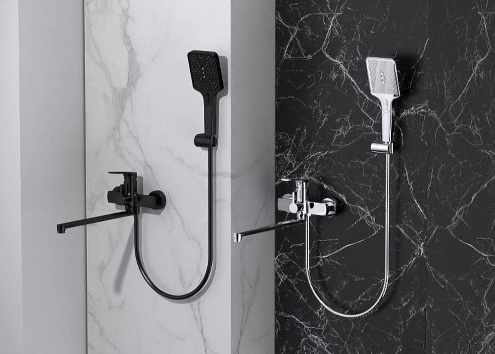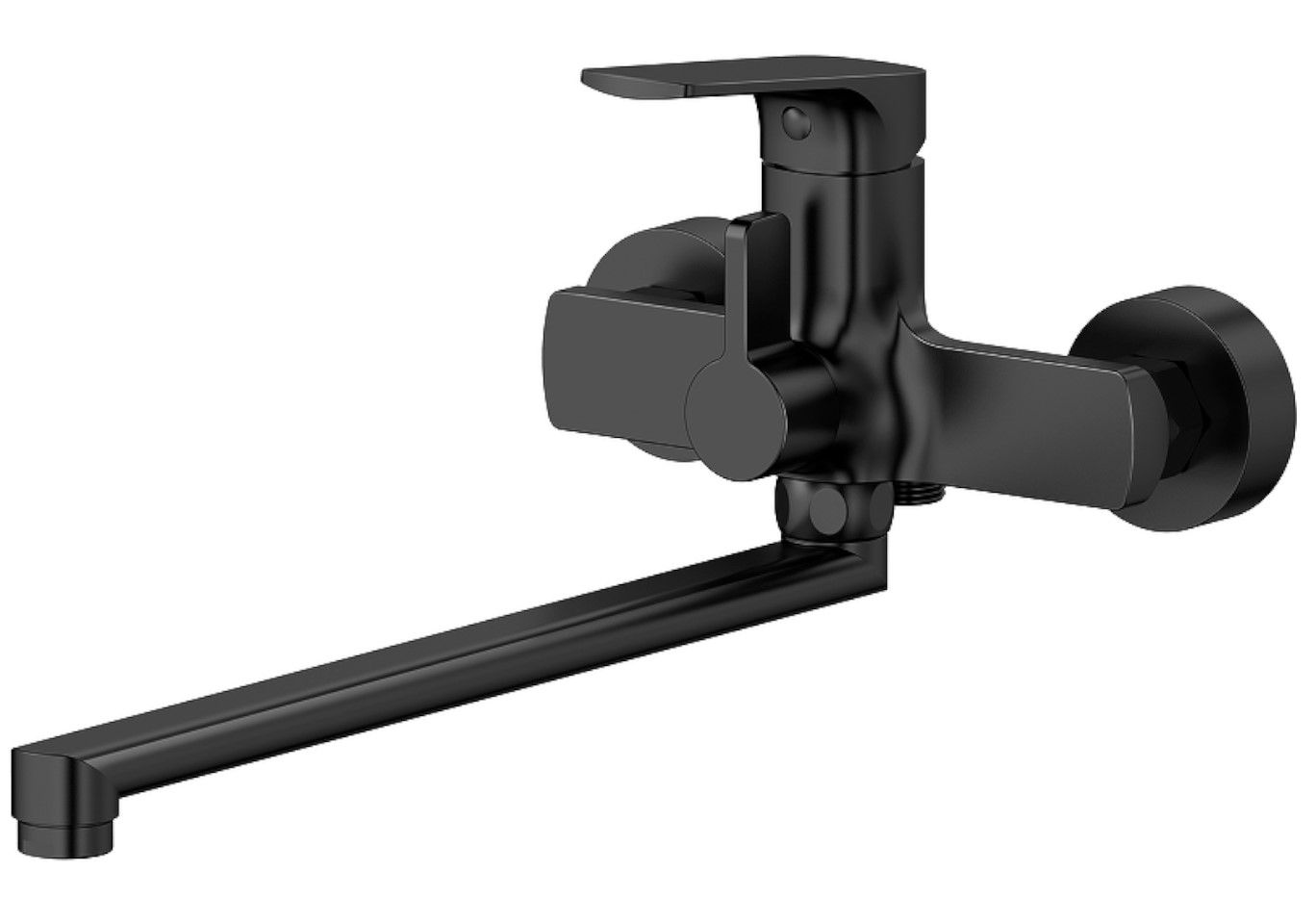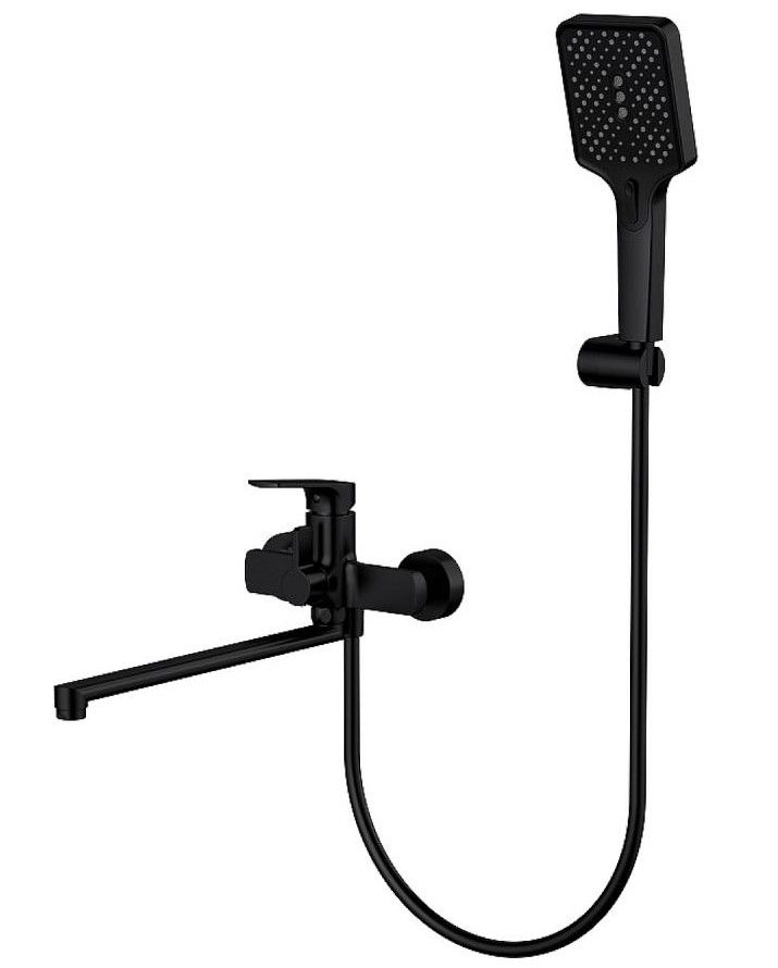 Смеситель для ванны Splenka S06.22.06 универсальный. Цвет: черный. Материал: латунь. Управление: однорычажное. Механизм: керамический картридж. Излив: поворотный. Стандарт подводки: G 1/2. Аэратор. Переключатель ванна/душ. Монтаж: на стену. Душевая лейка - 3 режима.