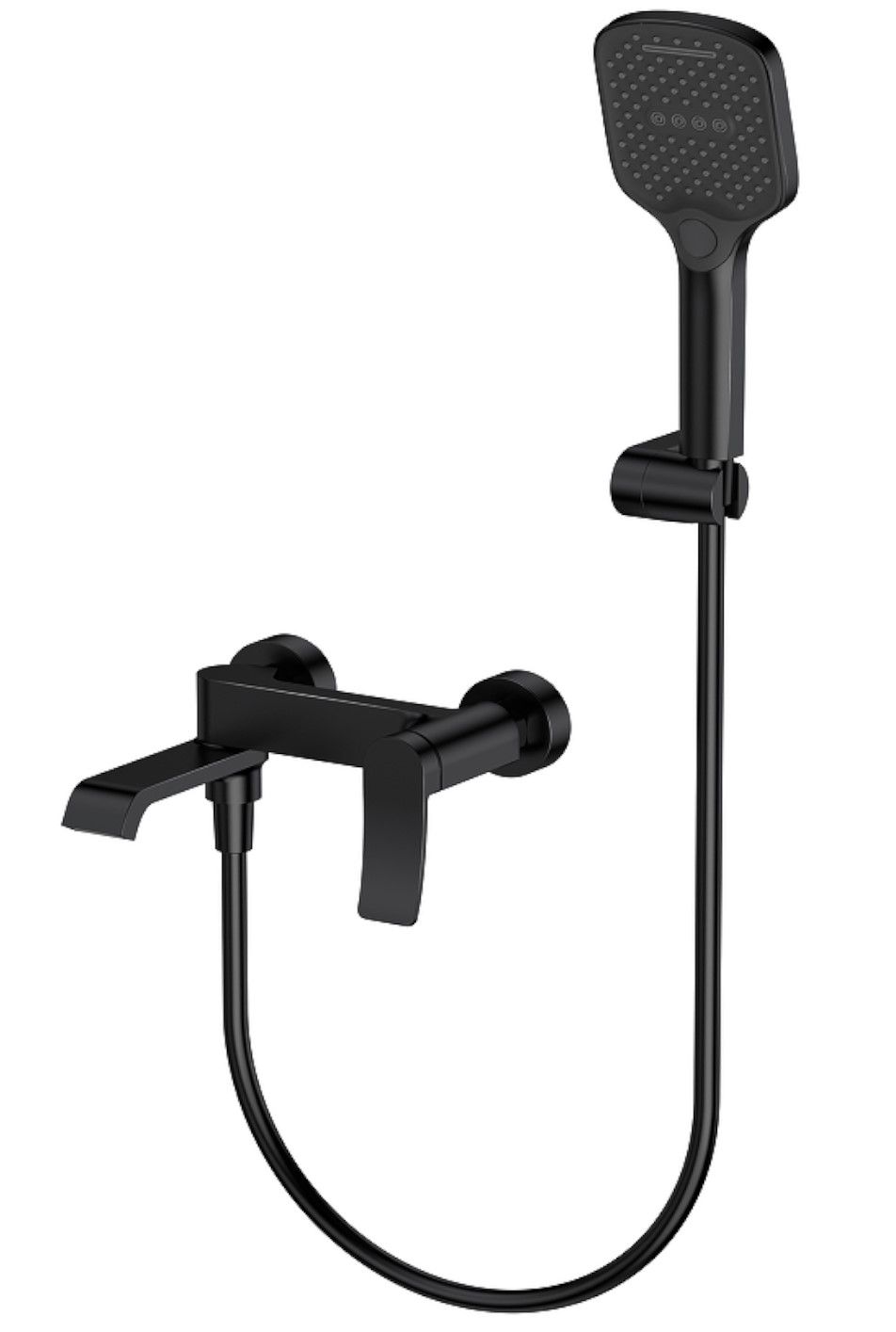 Смеситель для ванны Splenka S31.30.06. Цвет: черный. Материал: латунь. Управление: однорычажное. Механизм: керамический картридж. Излив: поворотный. Тип излива: каскадный. Аэратор. Стандарт подводки: G 1/2. Отверстия для монтажа: 2. Монтаж: на стену. Душевая лейка - 3 режима.