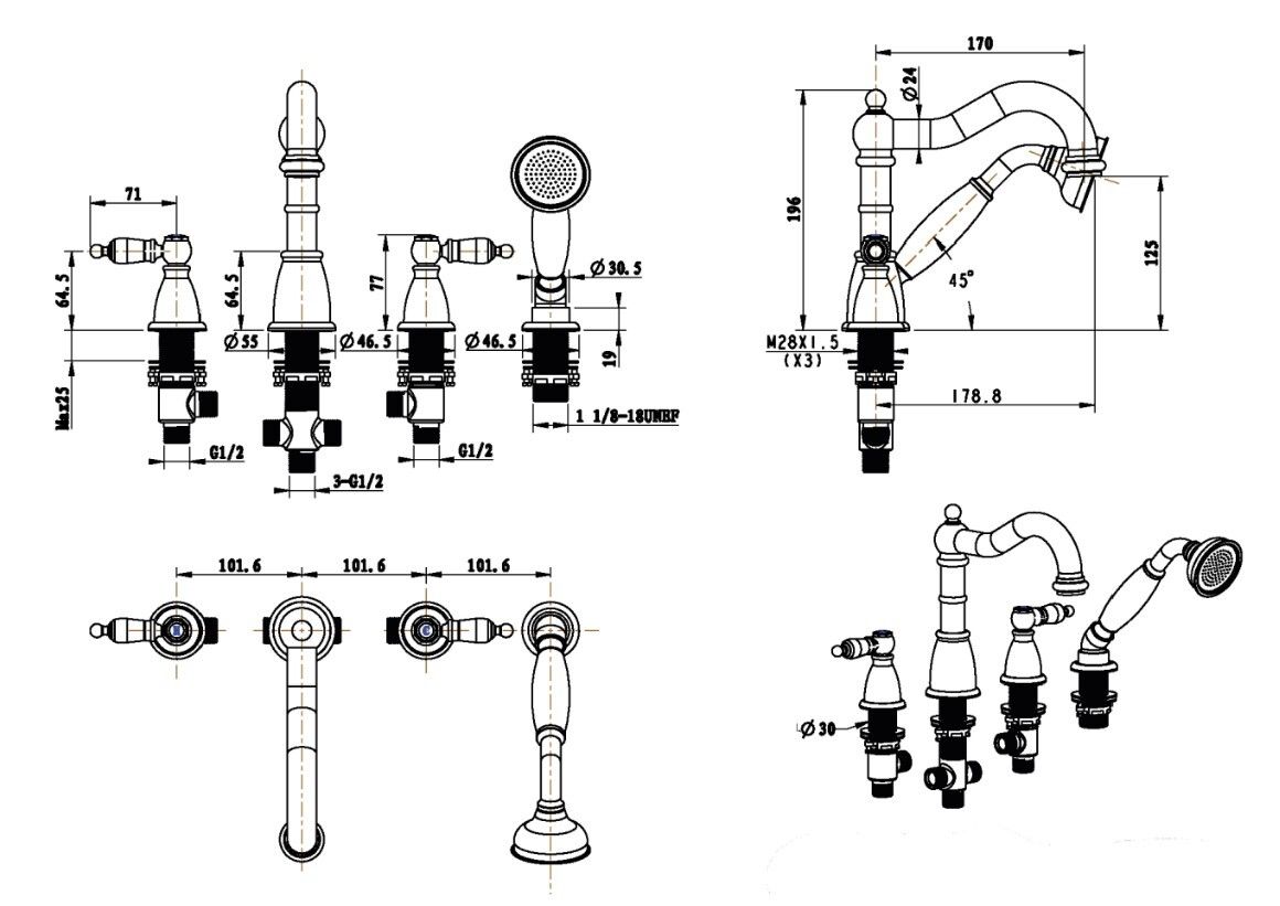 Смеситель на борт ванны Boheme 4отв. ROYAL CRISTAL, бронза