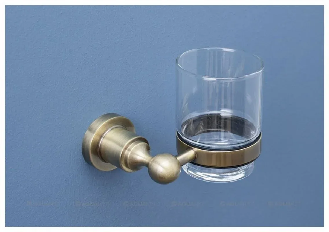 Стакан Aquanet 3884 выполнен в ретро-стиле. Колорит изделию придает золотисто-медный оттенок латуни и живописные элементы декора. Одним из таких элементов служит оригинальной формы деталь, которая является одновременно местом присоединения аксессуара к стене, в которой прячутся крепежи, с другой - основанием для крепления детали в форме кольца, в которую помещают стакан. Лаконично и эффектно. Выполнено основание модели из латуни - сплава меди с цинком. Этот материал зарекомендовал себя как надежный и стойкий к коррозии, что для влажной среды особенно актуально.
