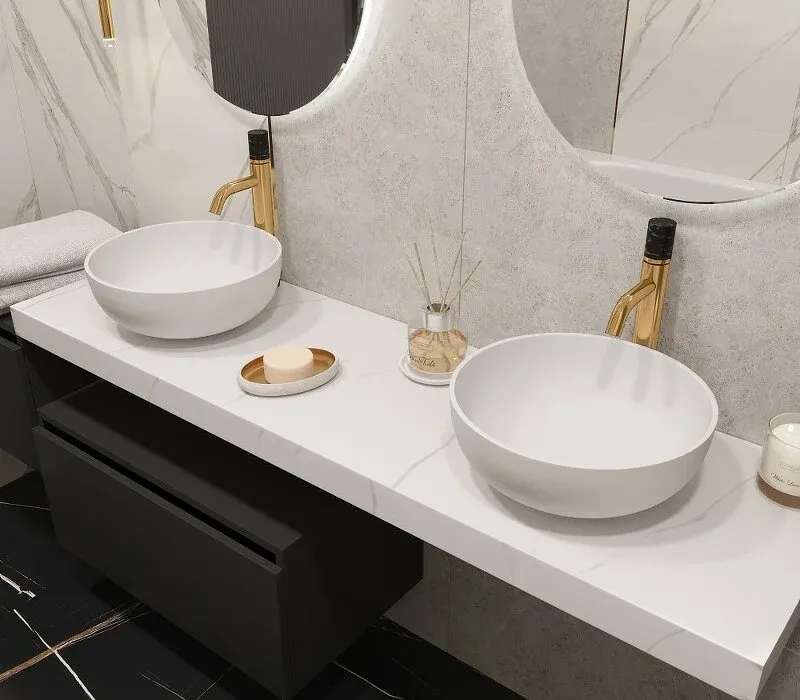 Столешницы и раковины по периметру имеют борт высотой 8см и скрытый крепеж. Подвесные тумбы и ArmadiArt выполнены в размерах 60см, 80см, 100см, 120см и 140см.