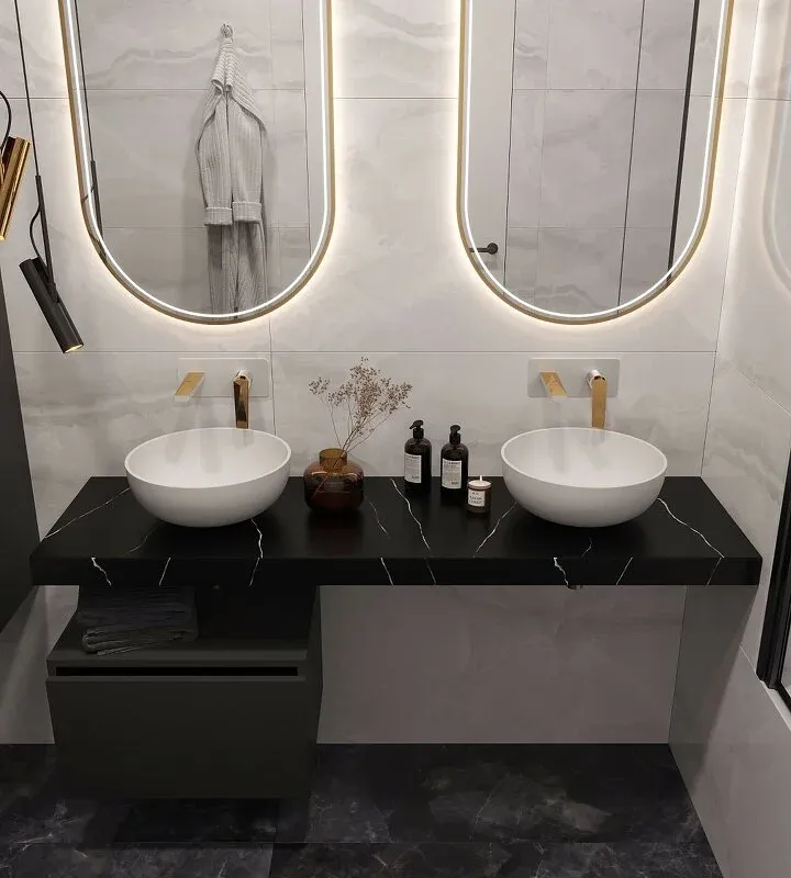 Столешницы и раковины по периметру имеют борт высотой 8см и скрытый крепеж. Подвесные тумбы и ArmadiArt выполнены в размерах 60см, 80см, 100см, 120см и 140см.