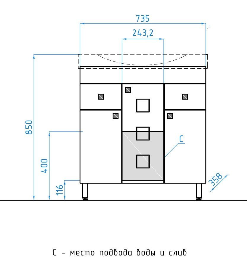 Тумба напольная "Крокус" с декоративными зеркальными вставками на фасаде,края которых обработаны фацетом. Фурнитура - хром, ручки "мозаика", петли на дверцах с механизмом плавного закрывания. Направляющие полного выдвижения Hettich, обеспечивающие плавность и бесшумность хода, высокую надежность и прочность. Данная тумба предусматривает открытую подводку воды