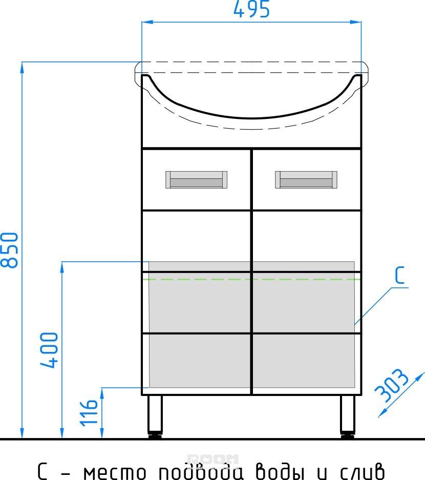 Тумба напольная бренда "Style Line" коллекции "Жасмин" со стильными врезными ручками. Фурнитура - хром, направляющие полного выдвижения Hettich; сборка изделия с помощью эксцентриковых стяжек Hafele; все материалы полностью влагостойкие. Данная тумба предусматривает открытую подводку воды