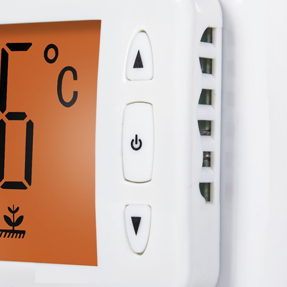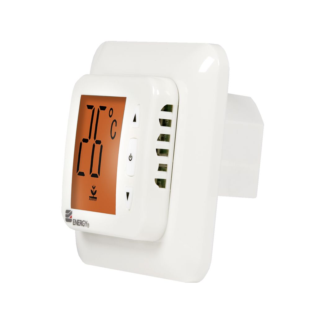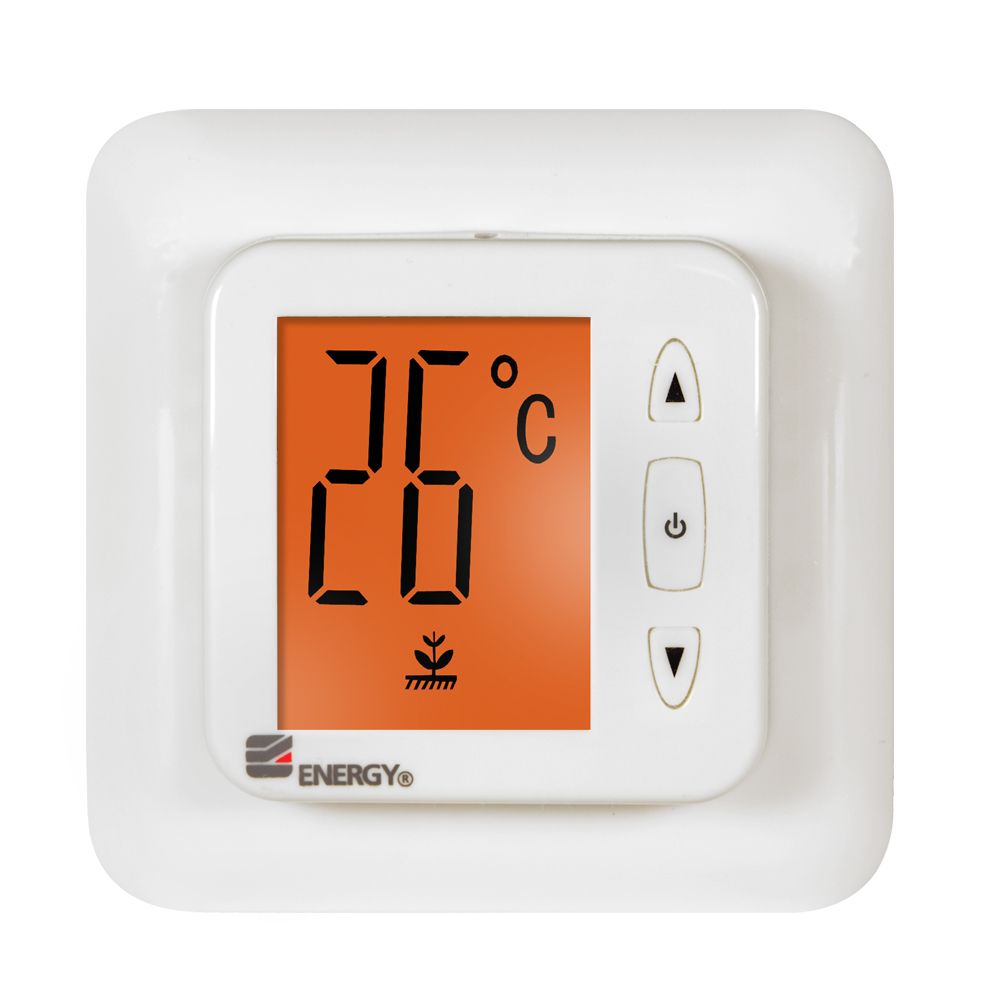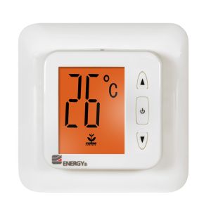 Электронный терморегулятор с выносным термодатчиком и большим жидкокристаллическим дисплеем Energy TK02 устанавливается в стандартную электромонтажную коробку. Размеры терморегулятора соответствуют размерам выключателя «евростандарт», поэтому он может использоваться в стандартных единых монтажных рамках совместно с другими выключателями.Температура регулируется в диапазоне +5°С - +40°С. Термостат управляется тремя кнопками, находящимися на лицевой части прибора. Информация о режиме работы и текущей температуре отображается на жидкокристаллическом дисплее. Одновременно с нажатием кнопки включается оранжевая подсветка, что позволяет настраивать устройство даже в темном помещении.Благодаря высокой точности установки температуры существенно сокращается время работы тепловой системы, как следствие, снижаются расходы на потребляемую электроэнергию.Термостат Energy TK02 подходит для любых систем электрического отопления внутри помещений. Защита корпуса терморегулятора от конденсата (IP 21) допускает установку даже во влажные помещения. Также предусмотрено автоматическое отключение нагревательной секции в случае выхода датчика температуры пола из строя.