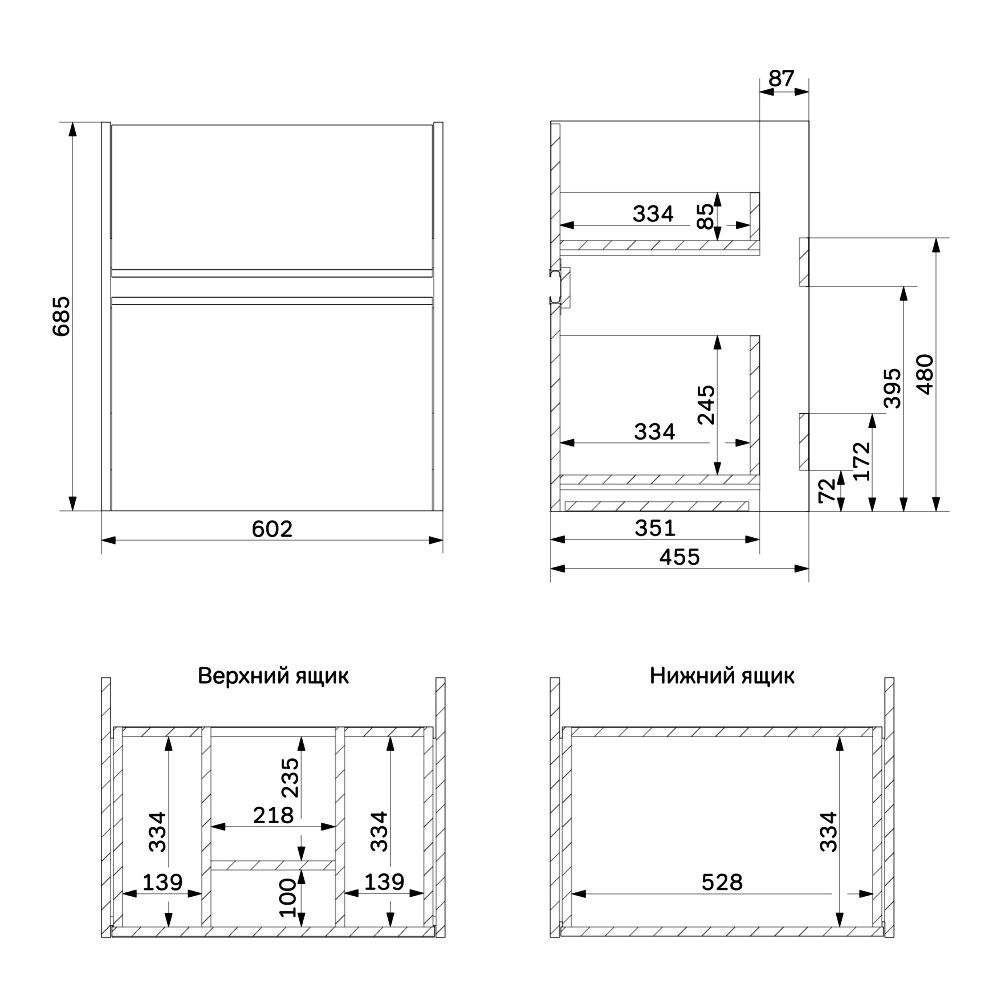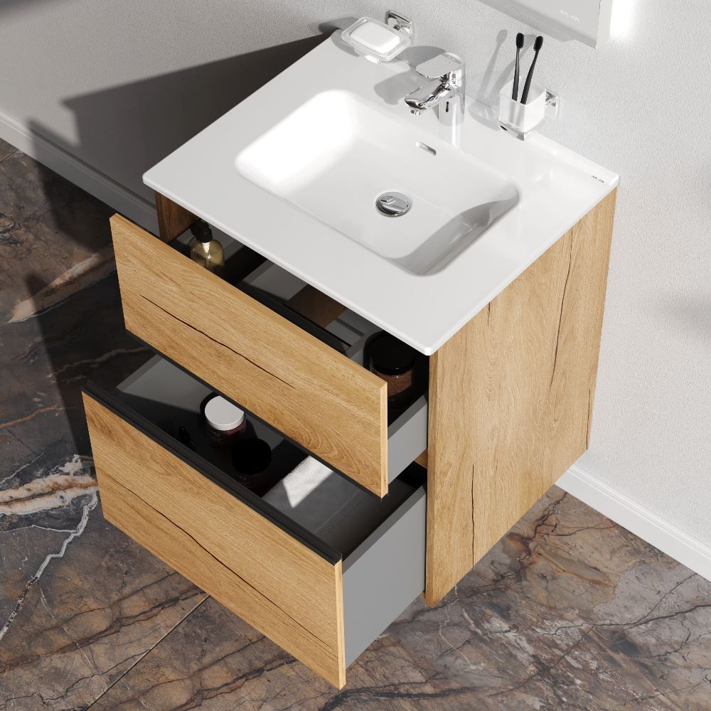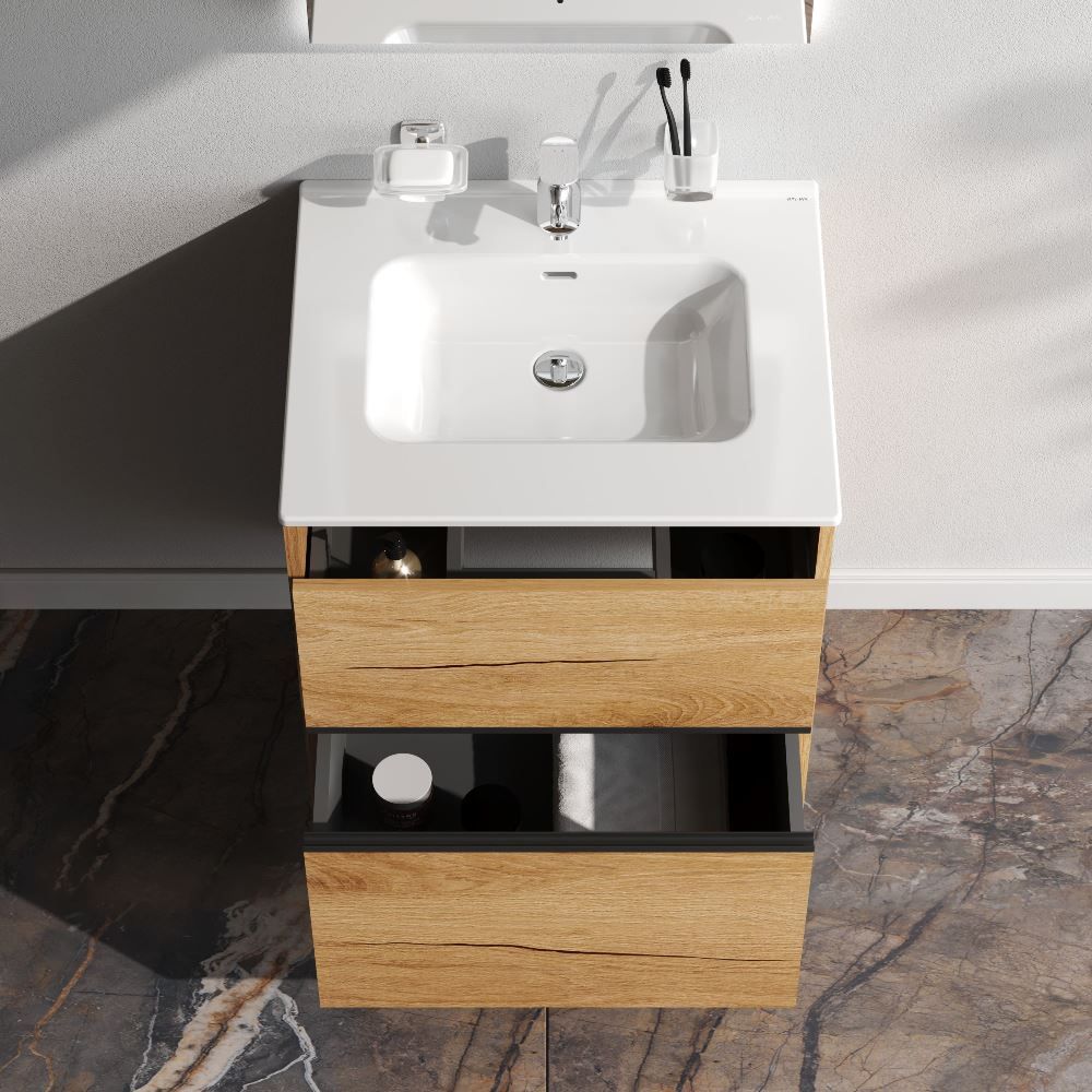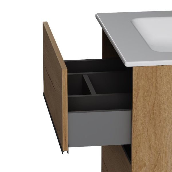 Два вместительных ящика на направляющих Soft-close скрытого монтажа, которые обеспечивают плавное и бесшумное открывание и закрывание - использование тумбы максимально комфортное. Элегантная черная акцентная металлическая профильная ручка придает изделию современный и стильный вид, подчеркивая его уникальность. Самые  популярные цвета: белый глянцевый для создания светлого и воздушного пространства, и под натуральное дерево, который добавит тепла и уюта в ваш интерьер.