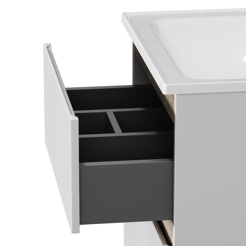 Функционал хранения бытовой химии в тумбе с раковиной обеспечивает организованное и безопасное размещение моющих средств, что способствует поддержанию порядка и упрощает доступ к необходимым материалам в процессе уборки. Оптимизация хранения вещей внутри ящиков. Грамотно расположенные скрытые коммуникации внутри тумбы. Устойчивая конструкция благодаря надежным ножкам. Бортик по контуру раковины и база под смеситель в виде острова предотвращают пролив воды за мебель. Материал раковины препятствует накоплению грязи и бактерий, что облегчает чистку и поддержание гигиены.