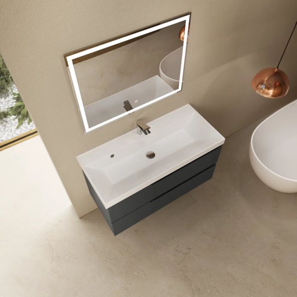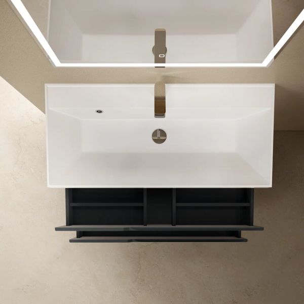 Тумба под раковину подвесная 1000*450 мм (антрацит матовый). Корпус и фасад тумбы выполненные из качественного МДФ имеют полимерное покрытие, что обеспечивает долговечность и защиту от влаги. Два вместительных ящика с системой плавного закрывания. Для раковин 4670142930839 или 1017001000001 или 4627173210201 - в комплект раковина не входит.