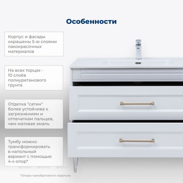 Тумбу можно использовать как навесную или трансформировать в напольную — для этого потребуется дополнительный комплект из 4 опор Бостон new.