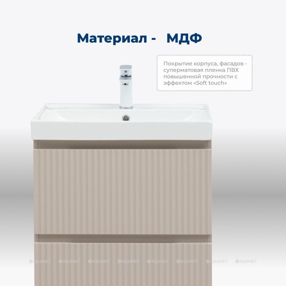 Тумба под раковину Aquanet Джейн (Flat) 60 бежевый — практичное и стильное решение для ванной комнаты. Корпус и фасады изготовлены из МДФ, покрытого суперматовой пленкой ПВХ повышенной прочности с эффектом «Soft touch». Покрытие не только приятное на ощупь, но и надежно защищает мебель от влаги. Полимерная структура пленки не пропускает воду, поэтому тумба не деформируется со временем и сохраняет первоначальный вид.
