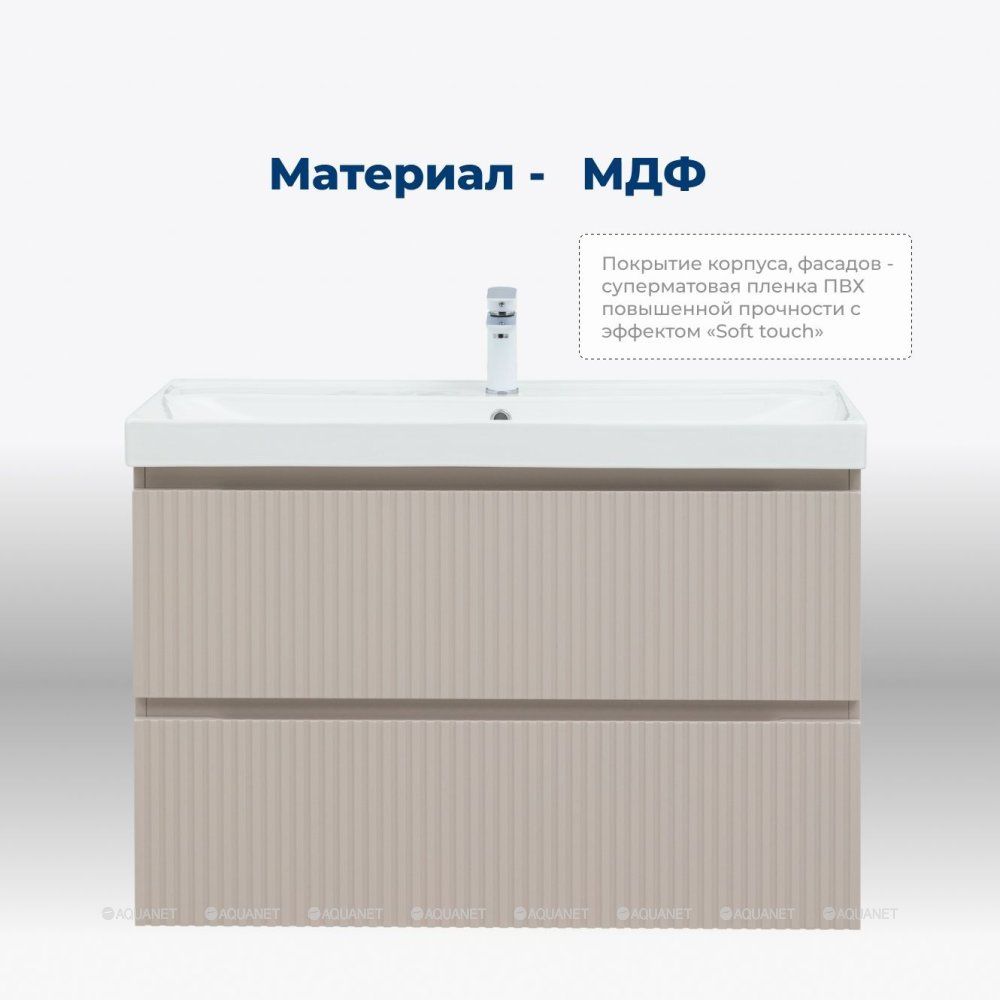 Тумба под раковину Aquanet Джейн (Flat) 90 бежевый — практичное и стильное решение для ванной комнаты. Корпус и фасады изготовлены из МДФ, покрытого суперматовой пленкой ПВХ повышенной прочности с эффектом «Soft touch». Покрытие не только приятное на ощупь, но и надежно защищает мебель от влаги. Полимерная структура пленки не пропускает воду, поэтому тумба не деформируется со временем и сохраняет первоначальный вид.