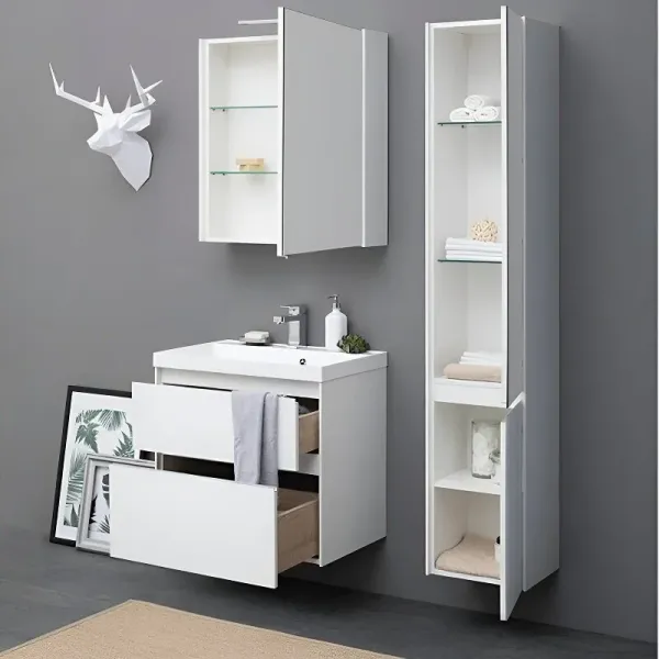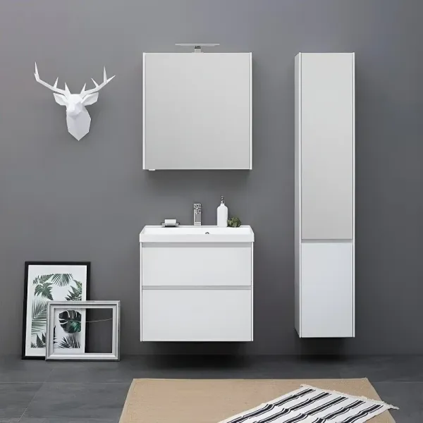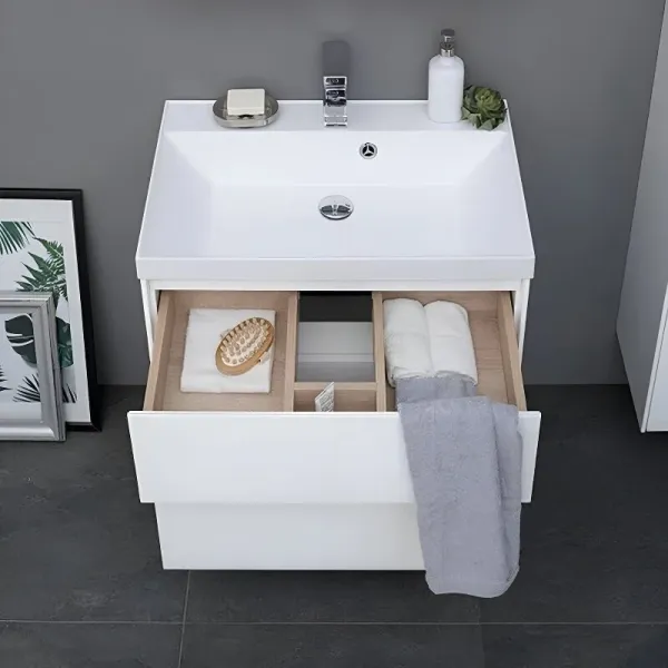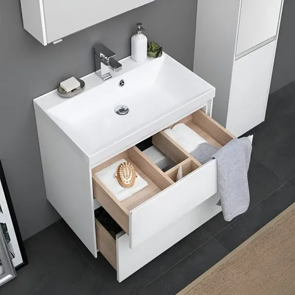 Тумба под раковину Aquanet «Гласс» 80 крепят к стене или устанавливают на четыре ножки высотой 200 мм (не входят в набор, артикул 00181454). Для изготовления корпуса использован материал МДФ белого цвета, который подходит для эксплуатации в условиях повышенной влажности. Шкафчики оснащены доводчиком и позволяют компактно хранить бытовую химию, гигиенические принадлежности и косметику. Габариты — 790х445х610 мм.