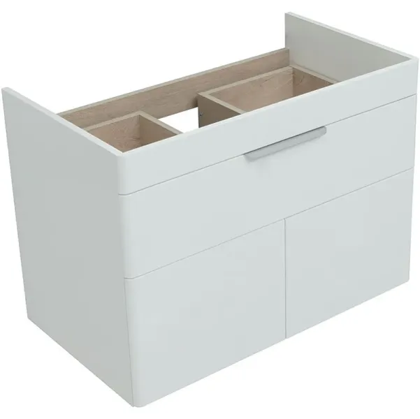 Особое внимание уделено безопасности: скругленные углы раковины и мебели минимизируют риск травм, что особенно важно в семьях с детьми. Направляющие скрытого монтажа с доводчиком обеспечивают плавное и бесшумное закрытие дверец, что добавляет комфорта в повседневное использование.