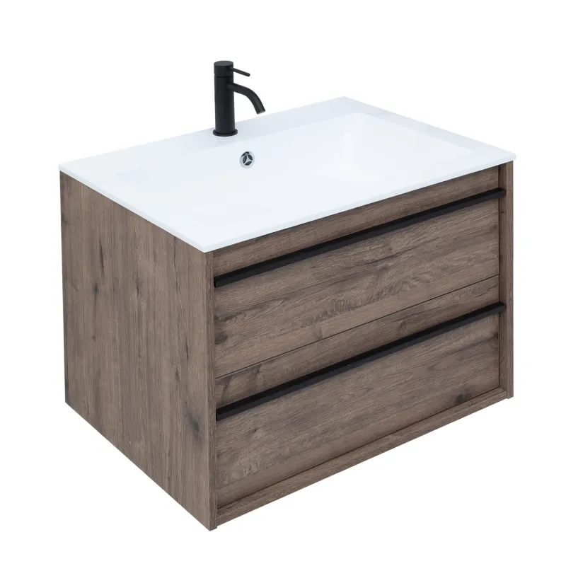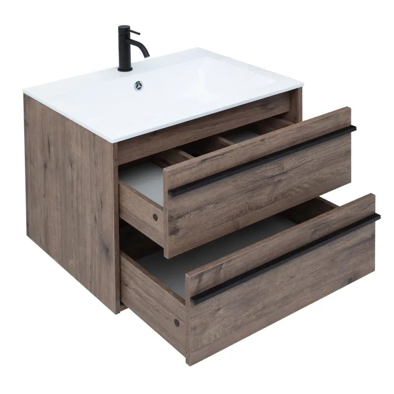 Тумба под раковину Aquanet Lino 70 в цвете "дуб веллингтон" - яркий пример мебели в эко-стиле. Яркая, приятная глазу цветовая гамма плюс текстурная поверхность, максимально приближенная по тактильным ощущениям к натуральной древесной поверхности, является визитной карточкой коллекции. У нее удобная зона хранения: два выдвижных ящика, оборудованных доводчиками, словно утоплены внутрь корпуса. Тонкие изящные ручки во всю ширину ящиков. Именно они находятся в одной плоскости с боковыми стенками. Выглядит стильно. К тому же, безопасно, так как нет выступающих деталей. Кстати, ручки отечественного производства. Сделаны из алюминия, чтобы исключить возможность коррозии, по заказу Aquanet специально для этой коллекции. Сверху на них нанесено эмалевое покрытие. Корпус и фасады тумбы шириной 70 см – из влагостойкого ЛДСП. Сверху установлена раковина «Электра» из литьевого мрамора. У нее максимально глубокая и объемная чаша, но все внутренние детали скруглены, так что приведение ее в порядок не составит труда, так как грязь не будет скапливаться в уголках.