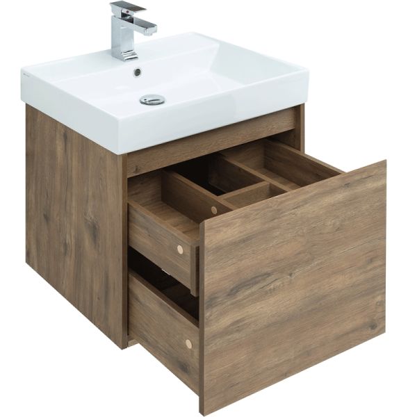 Тумба под раковину Aquanet Nova Lite 60 из влагостойкой ламинированной древесно-стружечной плиты в изысканном цвете «дуб рустикальный» имеет достойный вид. Фактура натурального дерева выглядит благородно, а подвесной монтаж придает визуальную легкость тумбе шириной 60 см. Она оборудована одним ящиком, при открывании которого обнаруживается еще один небольшой для мелочей. Фасад выполнен с декоративной интегрированной ручкой, не имеющей острых краев и внутренних углов, что обеспечивает удобство в эксплуатации и легкий уход за мебелью. Направляющие с доводчиками, так что при открывании и закрывании ящикам обеспечен плавный ход и отсутствие неприятных стуков. Неглубокая и стильная керамическая раковина «Латина» идеально подходит к тумбе.