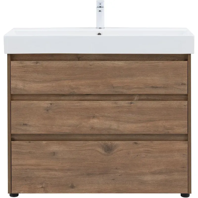 Тумба под раковину Aquanet Nova Lite 100 в дубово-рустикальном исполнении — идеальный вариант для дополнения ванной комнаты в любом из современных стилей. Лаконичный дизайн с претензией на натуральность позволяет освежить санузел смелым решением. Компактные размеры 982*825*450 мм подойдут как для малых помещений, так и для просторных. Напольная модель оснащена ножками и тремя выдвижными шкафами. Пространство внутри организовано для хранения вещей и бытовой химии с учетом коммуникаций для водоотведения. Корпус и фасад мебели изготовлены из влагостойкого ЛДСП, который препятствует образованию плесени и грибка при длительном взаимодействии с водой и влажным воздухом. Выдвижные шкафы оснащены механизмом доведения, что обеспечивает плавное закрытие. В комплект к тумбе можно купить подходящую по размерам керамическую раковину от Sanovit, например модель Slim Synergy, которая легко подсоединяется к мебели.