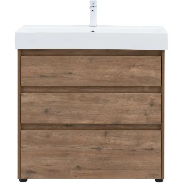 Тумба под раковину Aquanet Nova Lite 85 в рустикальном исполнении — идеальный вариант для дополнения ванной комнаты в любом из современных стилей. Лаконичный дизайн с претензией на натуральность позволяет освежить санузел смелым решением. Компактные размеры 820*736*435 мм подойдут как для малых помещений, так и для просторных. Напольная модель оснащена ножками и тремя выдвижными шкафами. Пространство внутри организовано для хранения вещей и бытовой химии с учетом коммуникаций для водоотведения. Корпус и фасад мебели изготовлены из влагостойкого ЛДСП, который препятствует образованию плесени и грибка при длительном взаимодействии с водой и влажным воздухом. Выдвижные шкафы оснащены механизмом доведения, что обеспечивает плавное закрытие. В комплект к тумбе можно купить подходящую по размерам керамическую раковину от Sanovit, например модель Slim Synergy, которая легко подсоединяется к мебели.