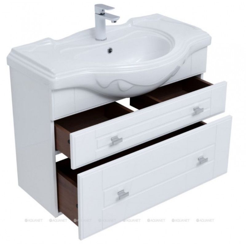 Тумба с раковиной Aquanet «Рондо» 85 в белом глянцевом корпусе оснащена двумя ящиками, обладающими разной высотой. Их можно использовать как для хранения гигиенических и косметических средств, так и для размещения порошков, гелей и кондиционеров для белья. На фронтальных панелях встроены аккуратные хромированные ручки прямоугольной формы.