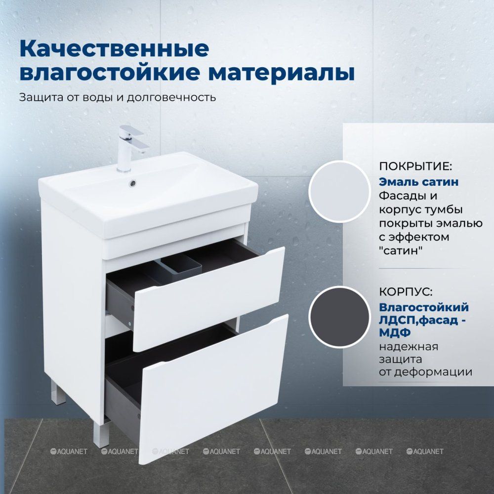 Тумба под раковину Aquanet Слим 60 напольная, белый сатин – компактное и функциональное решение для ванной комнаты. Она сочетает лаконичный дизайн и продуманные детали. Глубина тумбы с раковиной составляет 405 мм, что делает её удобной даже для небольших помещений.