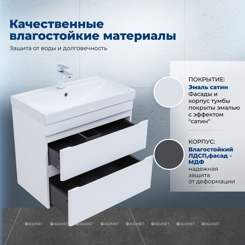 Тумба под раковину Aquanet Слим 80 белый сатин – компактное и функциональное решение для ванной комнаты. Она сочетает лаконичный дизайн и продуманные детали. Глубина тумбы с раковиной составляет 405 мм, что делает её удобной даже для небольших помещений.