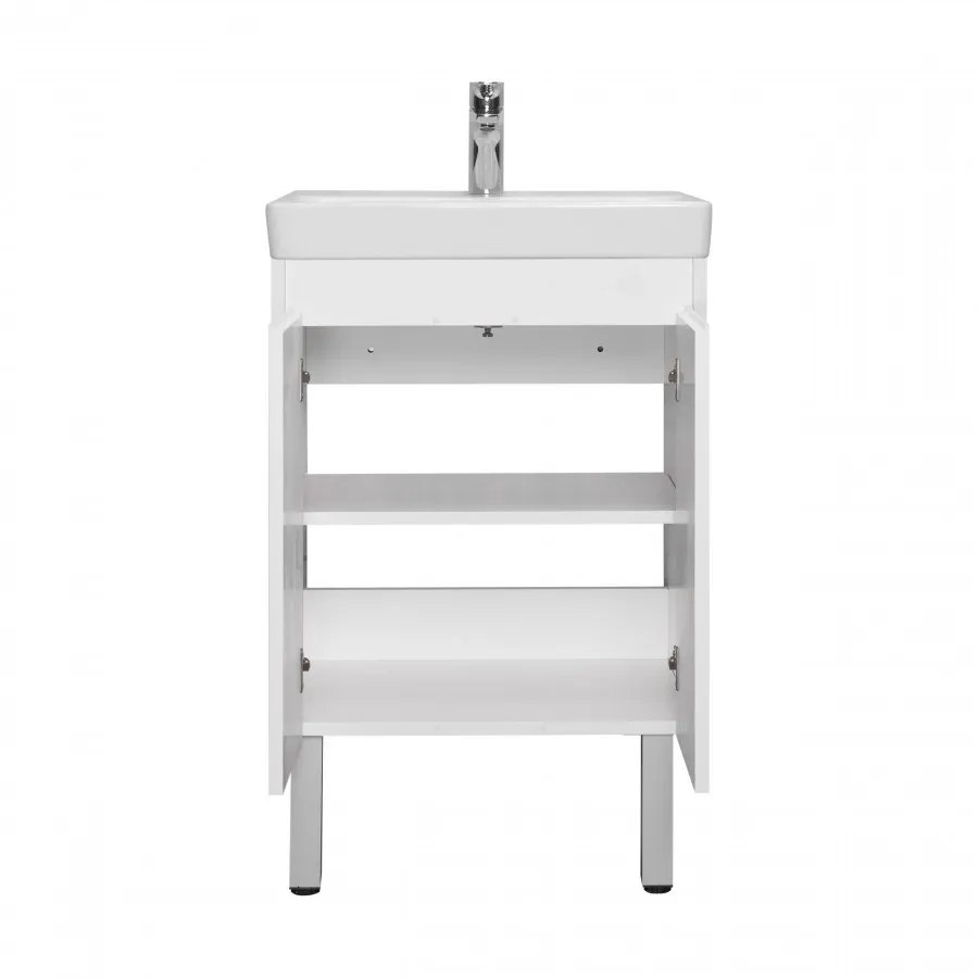 Тумба Сканди Doors 55 выполнена в популярном минималистичном скандинавском стиле. Корпус тумбы выполнен из влагостойкой ЛДСП в белой матовой покраске, а фасады-створки в белой глянцевой покраске. За створками скрывается вместительное пространство, разделенное на две части регулируемой по высоте полкой из ВЛДСП. На тумбе нет выступающих деталей и фурнитуры, открытие створок реализуется за фасад, верхняя часть которого обработана под ручку J-профиль. К тумбе идеально подходит белоснежная раковина Адриана от бренда Santek. Раковина продается отдельно.