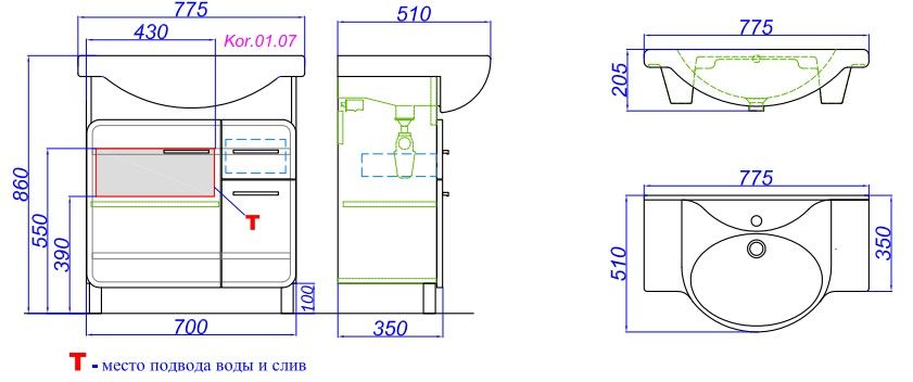 Напольная тумба с умывальником Стиль 750,две дверцы и ящик.