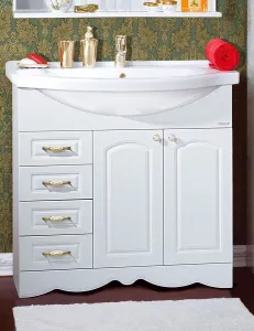 Удобная система хранения позволяет размещать все необходимое для гигиенических процедур, а её продуманные размеры отлично вписываются даже в небольшие помещения. Стильные ручки и элегантные фасады придают тумбе особый шарм, а разнообразие цветовых решений позволит выбрать модель, соответствующую любому интерьеру – от классического до модерн.