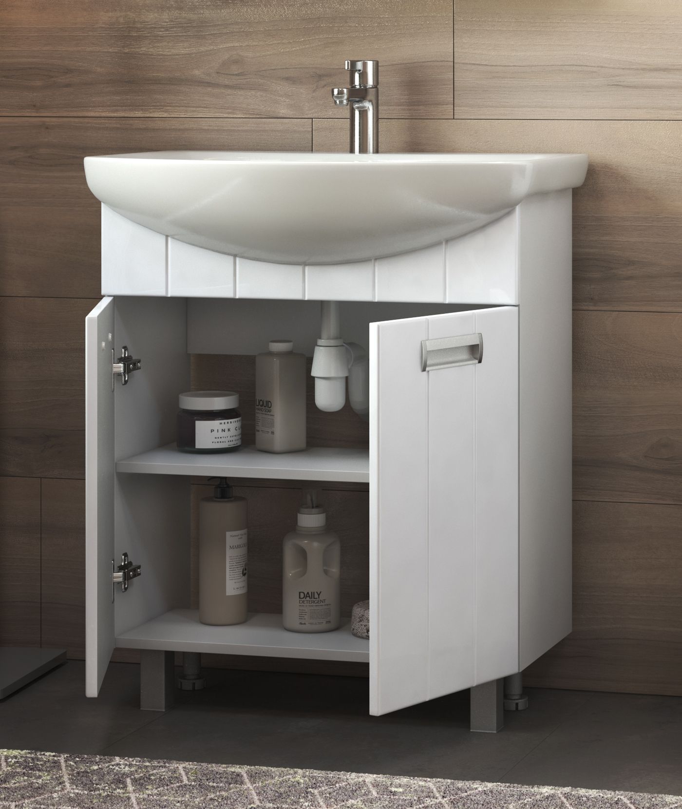 Оснащение: 2 дверцы; 1 полка ЛДСП; ручка врезная металлическая хромированная, опоры квадратные регулируемые.