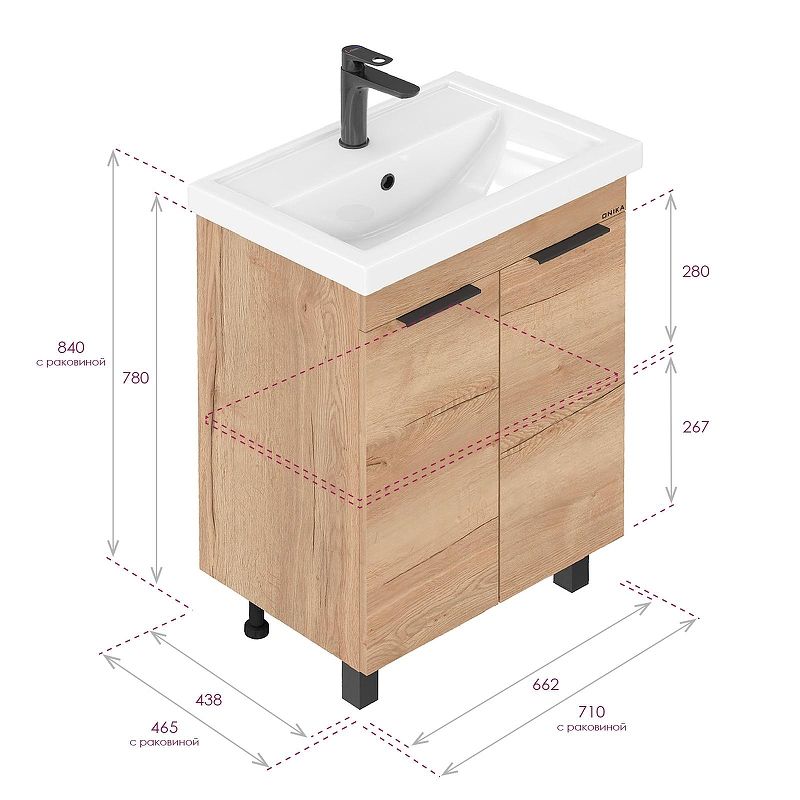 Размеры тумбы без учета раковины и ножек 66x44x68 см.