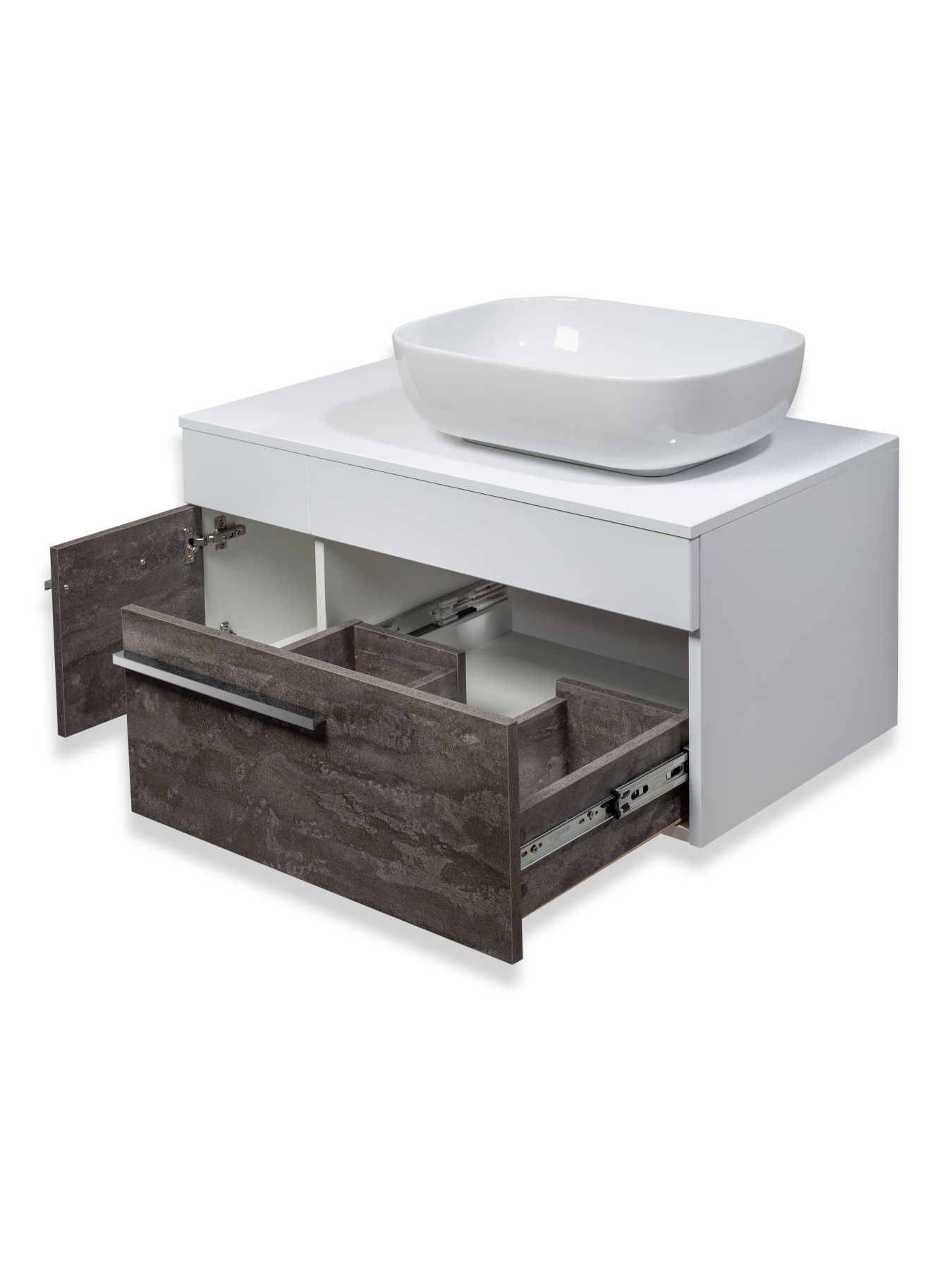 Тумба с раковиной в ванную RUNO ВУДЛАЙН (подвесная) - выполнена в ультрасовременном дизайне в цвете железный камень. Тумба в ванную оснащена выдвижным ящиком на шариковых направляющих, и одной распашной дверцей. Тумба под раковину ВУДЛАЙН гармонично впишется в любой интерьер ванной комнаты. В комплект входят: 2 ручки, петли со встроенным доводчиком, навесы для крепления к стене. К тумбе для ванной комнаты подходят накладные керамические раковины: Infinity 60 с чашей прямоугольной формы (600х370 мм), глубиной 12 см; Moduo 50 SQUARE с чашей прямоугольной формы (500х360 мм), глубиной 15 см; Moduo 55 LEAF - асимметричная раковина, которую можно установить любой стороной, дизайнерское решение для нестандартных интерьеров (565х365 мм), глубиной 15 см; Гамма 56 - c глубокой чашей и высокими бортиками, которые отражают современные тренды в дизайне. (560х370 мм), глубиной 18 см. Мебель для ванной RUNO - красота и практичность в мелочах!