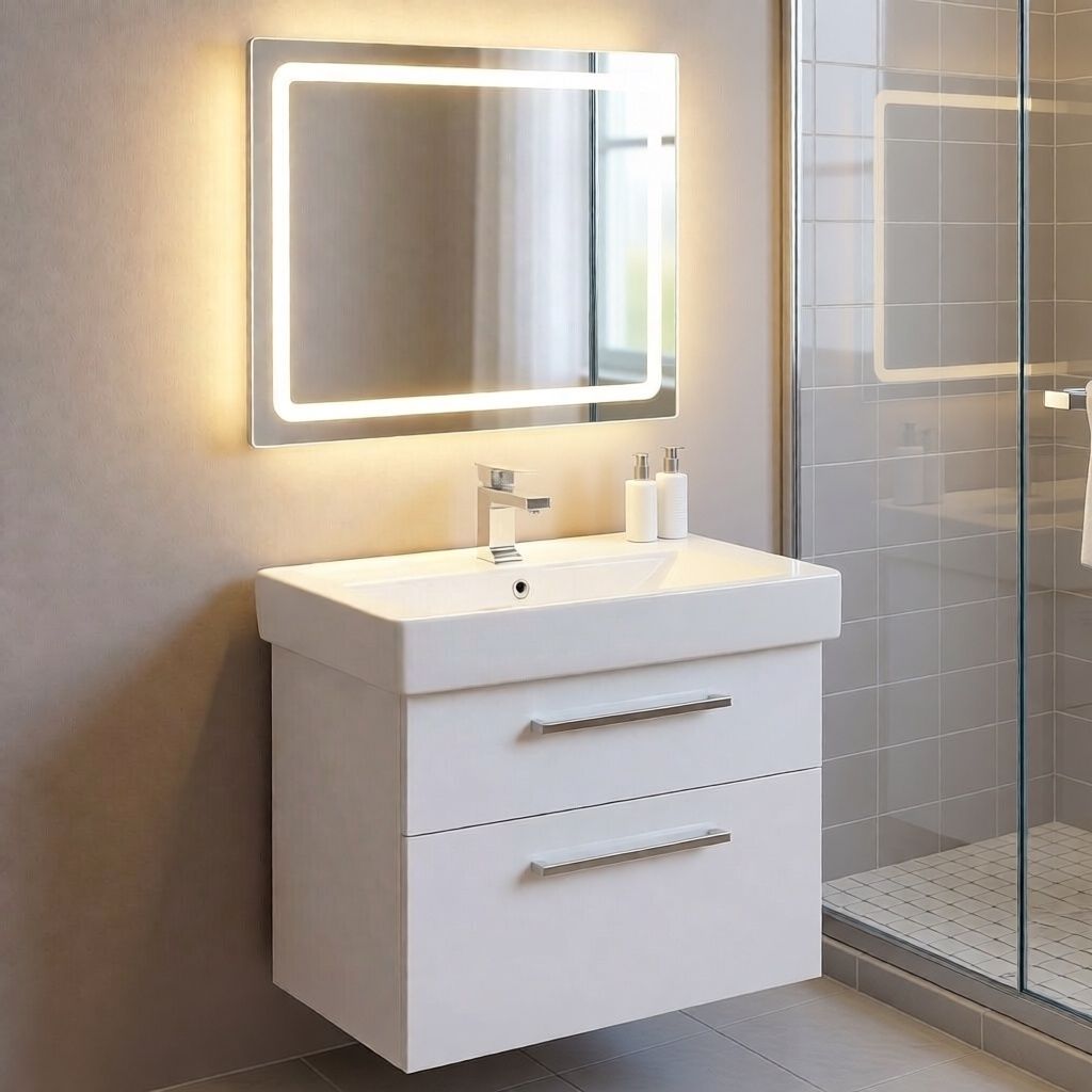 Тумба крепится к стене и дополнительно опирается на регулируемые ножки — устойчиво и надёжно. Можно использовать и как чисто подвесную, если стена позволяет.