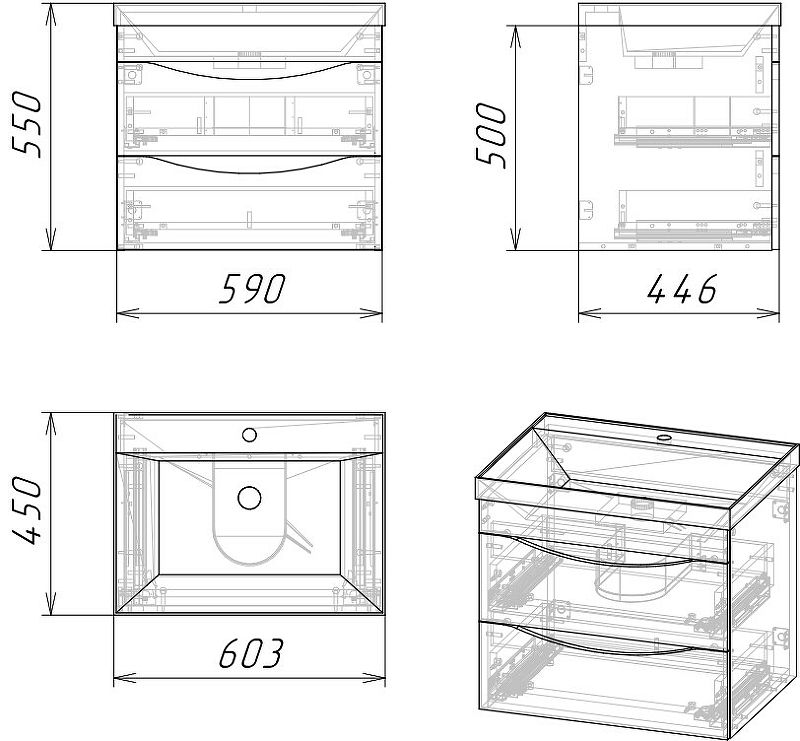 Габариты тумбы (ШxВxГ): 590x500x446 мм.