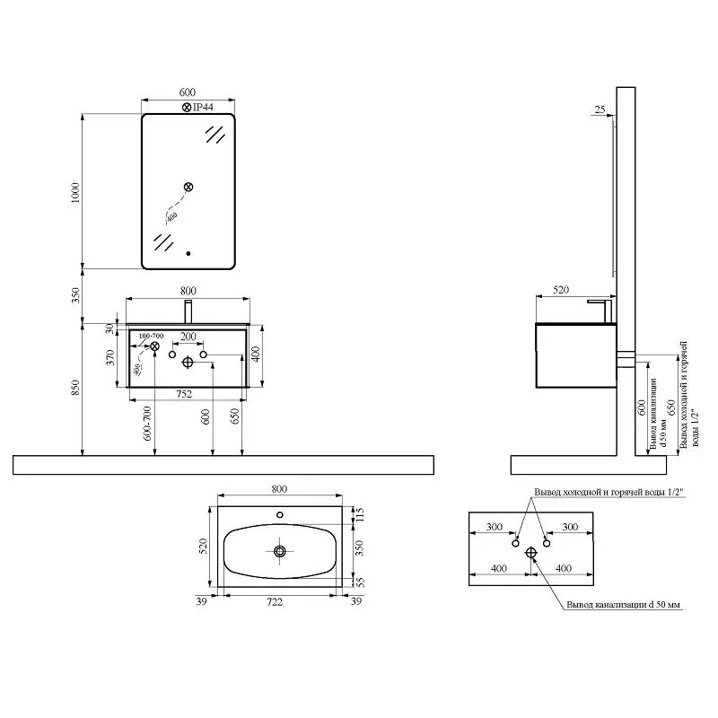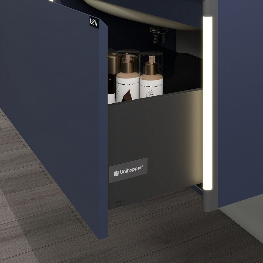 Тумба с раковиной для ванной комнаты датского производителя Black&White в габаритных размерах 80x52x36 см.Раковина – столешница асимметричной конфигурации с широкой чашей и расширенным местом для хранения ванных принадлежностей выполнена из не пористого искусственного камня Corian и оснащена донным клапаном хромированного цвета.Тумба производится из девятислойной фанеры и окрашена влагостойкой эмалью глубокого синего цвета.Зона хранения оснащена одним выдвижным ящиком с высоким фасадом, механизм открывания – UniHopper с доводчиками.Важной особенностью является контурная диодная подсветка, которая расположена справа и слева от фасада, установленная на торцы корпуса.Она включается автоматически при приближении человека с расстояния 3-х метров и гаснет спустя 30 секунд после того, как Вы покинули помещение. U 945 – продукт разработанный датскими дизайнерами, в котором собраны все тенденции актуального мебелестроения для комфортного использования зоны умывания, а также наполнения ванной комнаты комфортом и уютом.