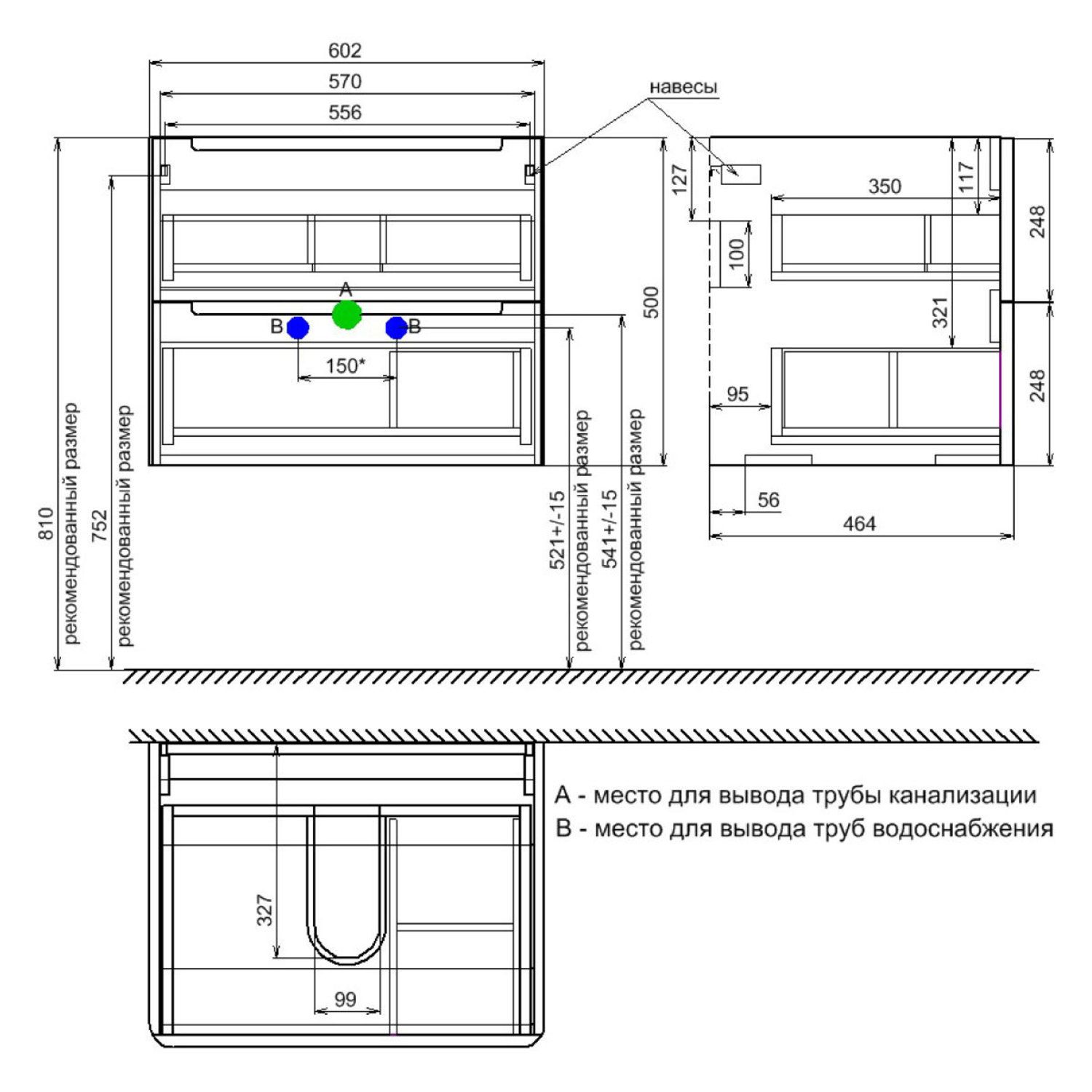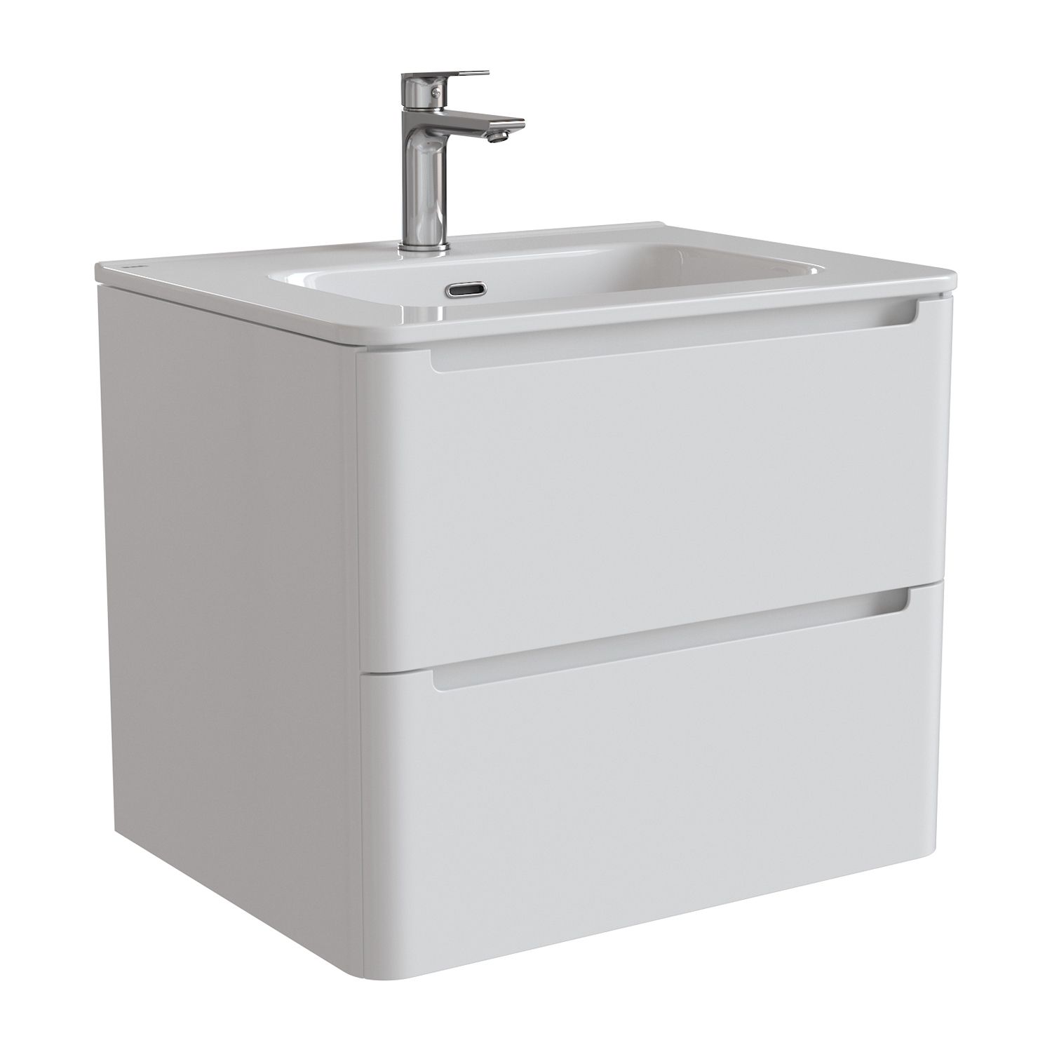 Тумба с умывальником для ванной комнаты, подвесная. Размеры: 467х602х500 мм (ДхШхВ). Фасад МДФ 19 мм в эмали (белый глянец), фрезеровка. Корпус ЛМДФ 16 мм в эмали. Интегрированные ручки. Два выдвижных ящика с механизмом плавного доведения. Пластиковый ограничитель под сифон в верхнем ящике. Перекатной организатор в нижнем ящике. Навесы усиленные с планкой. Упаковка: картон, пленка, пенопластовые уголки.