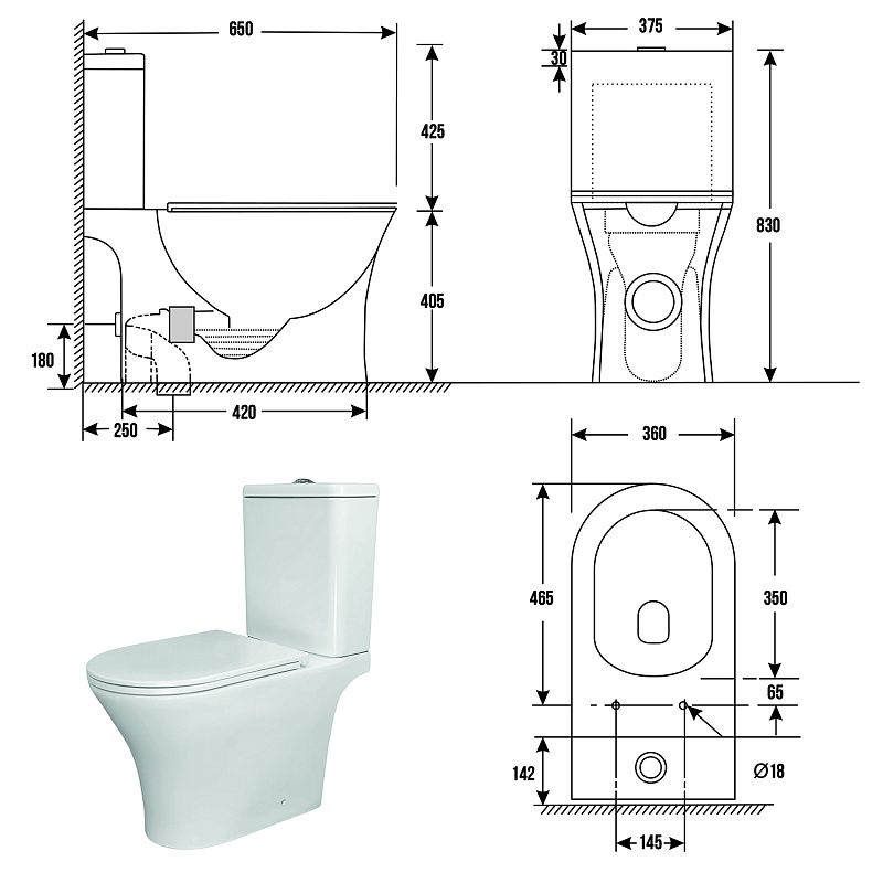 Размеры унитаза составляют 375х650х830 мм, что позволяет удобно разместить его в помещениях разного размера. Система слива «Торнадо» обеспечивает мощное и эффективное смывание, экономя воду и предотвращая засоры. Быстросъемное сиденье с функцией «Микролифт» из прочного дюропласта гарантирует комфорт и безопасность: крышка плавно опускается без хлопков и легко снимается для тщательной очистки.