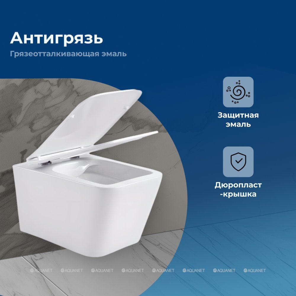 Современный подвесной унитаз Aquanet Rimless Tavr создан для компактных ванных и туалетных комнат благодаря своим габаритам 360х525х290 мм. Изготовлен из белой керамики, а в комплекте идет  удобная крышка-сиденье из дюропласта в тон устройству. Подвесная конструкция экономит место, делает пространство более технологичным и комфортным за счет размещения смывного механизма в стене. Снаружи вы устанавливаете аккуратную кнопку смыва с плавным нажатием. Дополнительные функции — режим антивсплеск и безободковое решение. В плане дизайна прямоугольный унитаз будто создан для стиля модерн, лофт, минимализм, хай-тек, эклектики и Скандинавии. Ваша задача — приобрести в дополнение хорошую инсталляцию для смыва, так как в комплекте с унитазом она не продается.