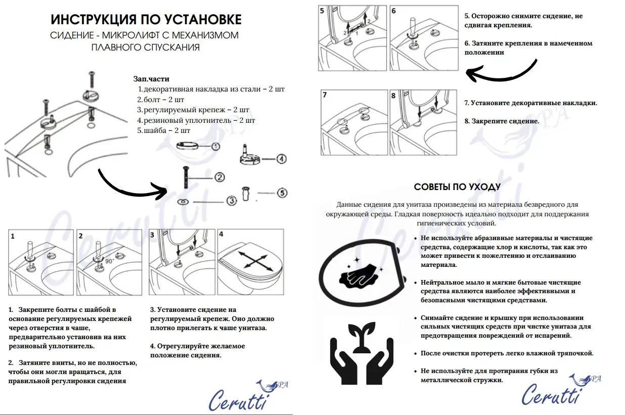 В комплекте присутствует легкосъемное сидение с крышкой, оснащенное системой микролифт (для плавного и бесшумного опускания). Крепления к чаше выполнены из стали, а само сидение - из дюропласта. Снятие осуществляется одним нажатием кнопки.
