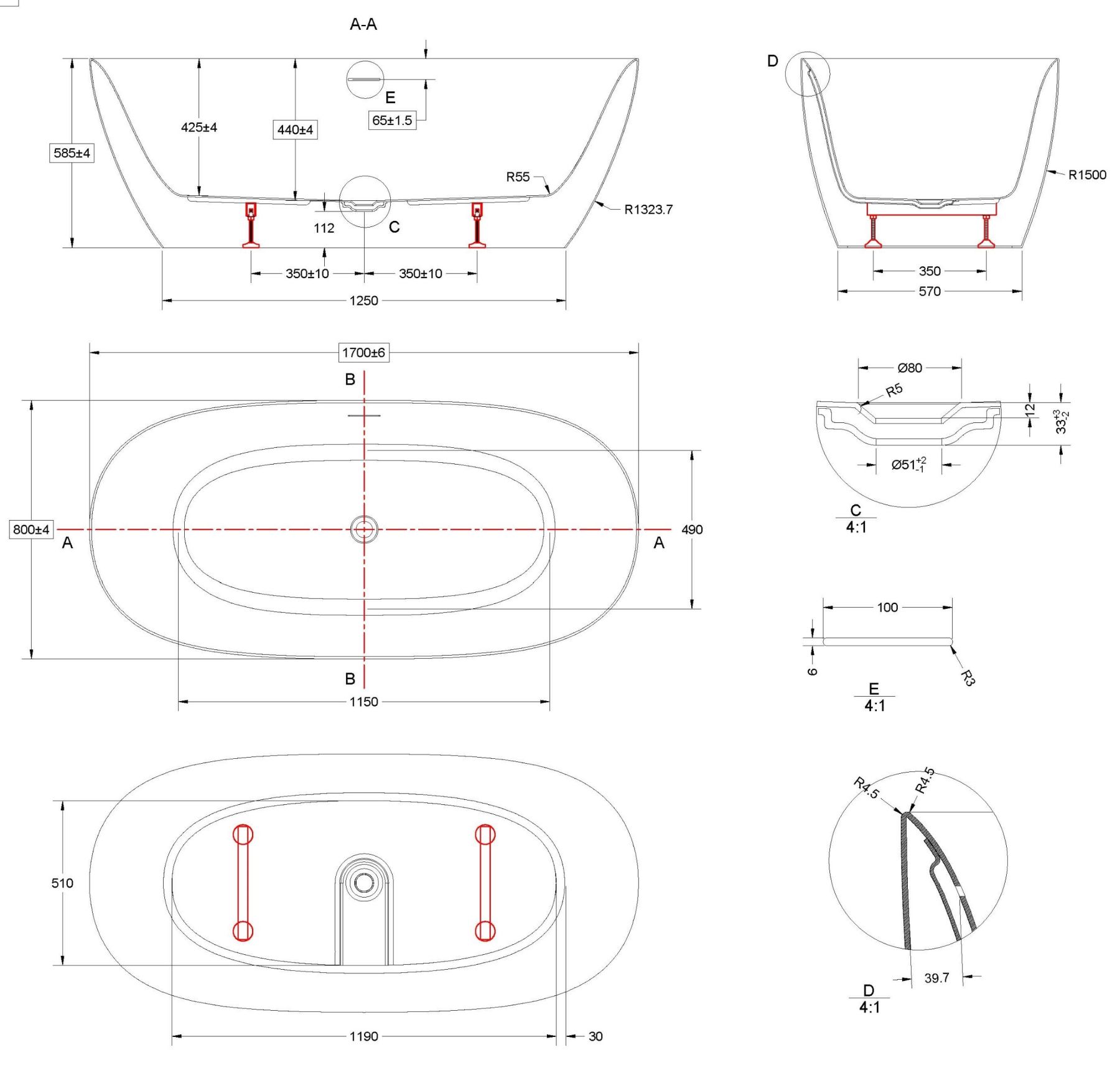 Ванна акриловая Vincea VBT-708-1700, цвет белый, щелевой перелив