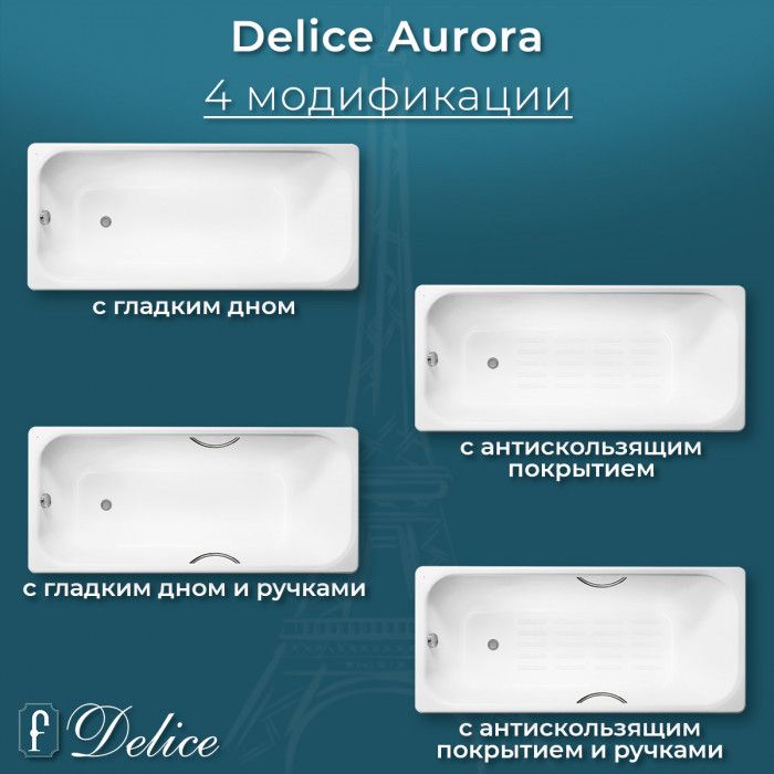 Данная модификация Delice Aurora выполнена с гладким дном. Такой вариант ванны очень прост в уходе, не требует времени и дополнительных усилий при чистке. Имеет безупречный внешний вид, который остается неизменным в течение всего периода службы.