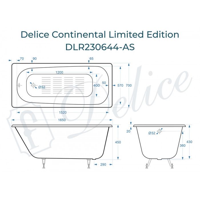 Ванна чугунная Delice Continental Limited Edition DLR230644-AS 165х70 с антискользящим покрытием купить