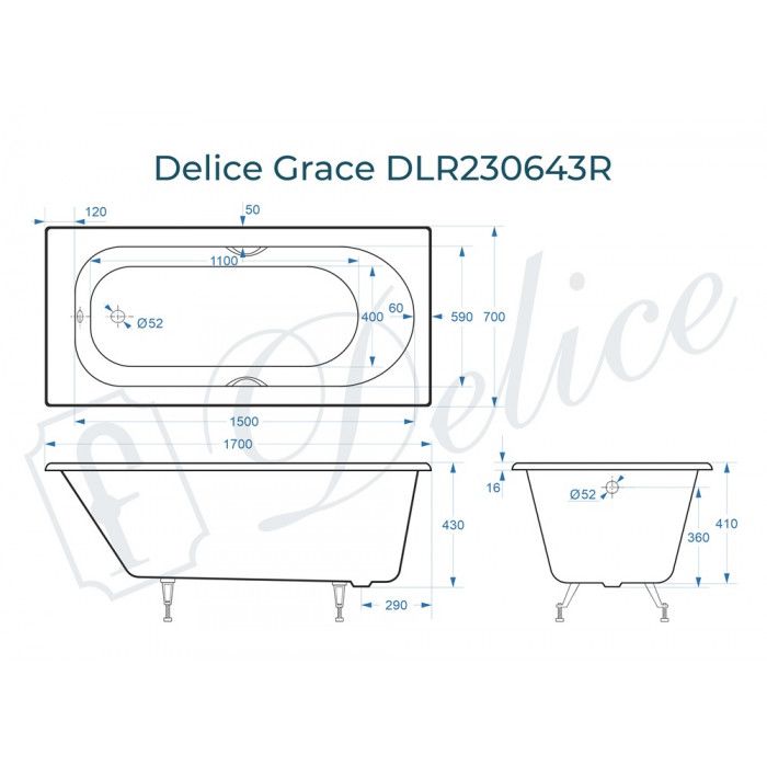 Ванна чугунная Delice Grace DLR230643R 170х70 с отверстиями под ручки купить