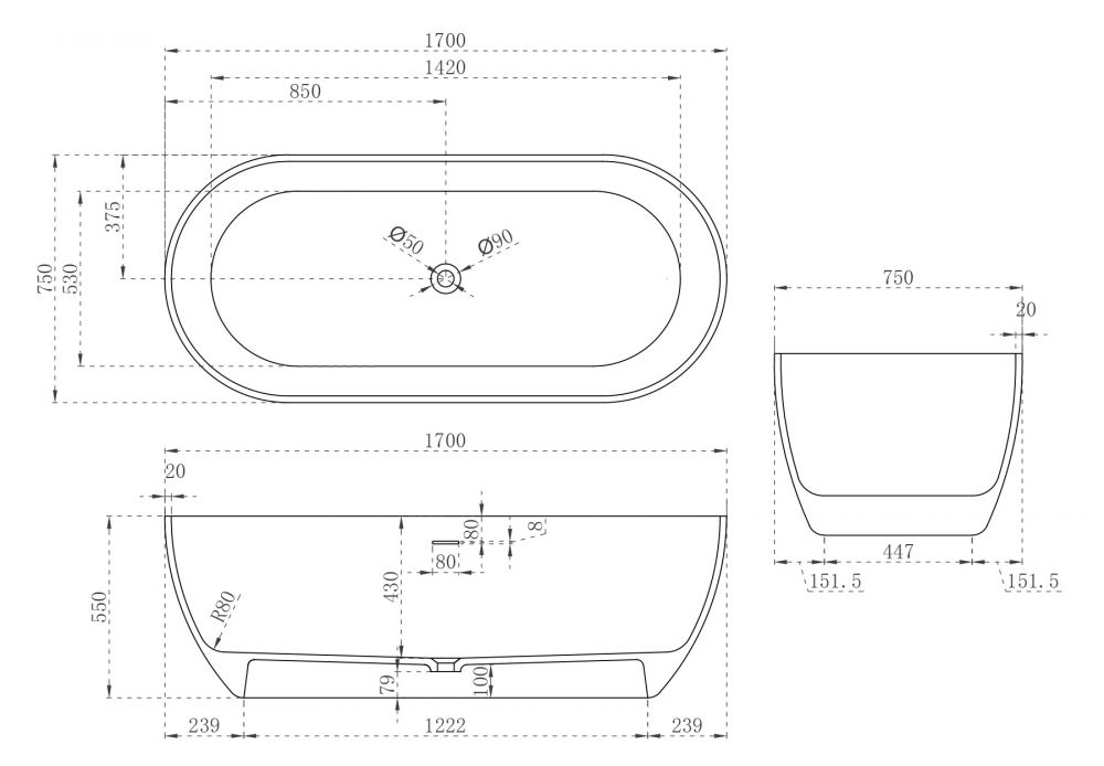 Ванна из искусственного камня ABBER Stein AS9613-1.7 170x75см белый матовый