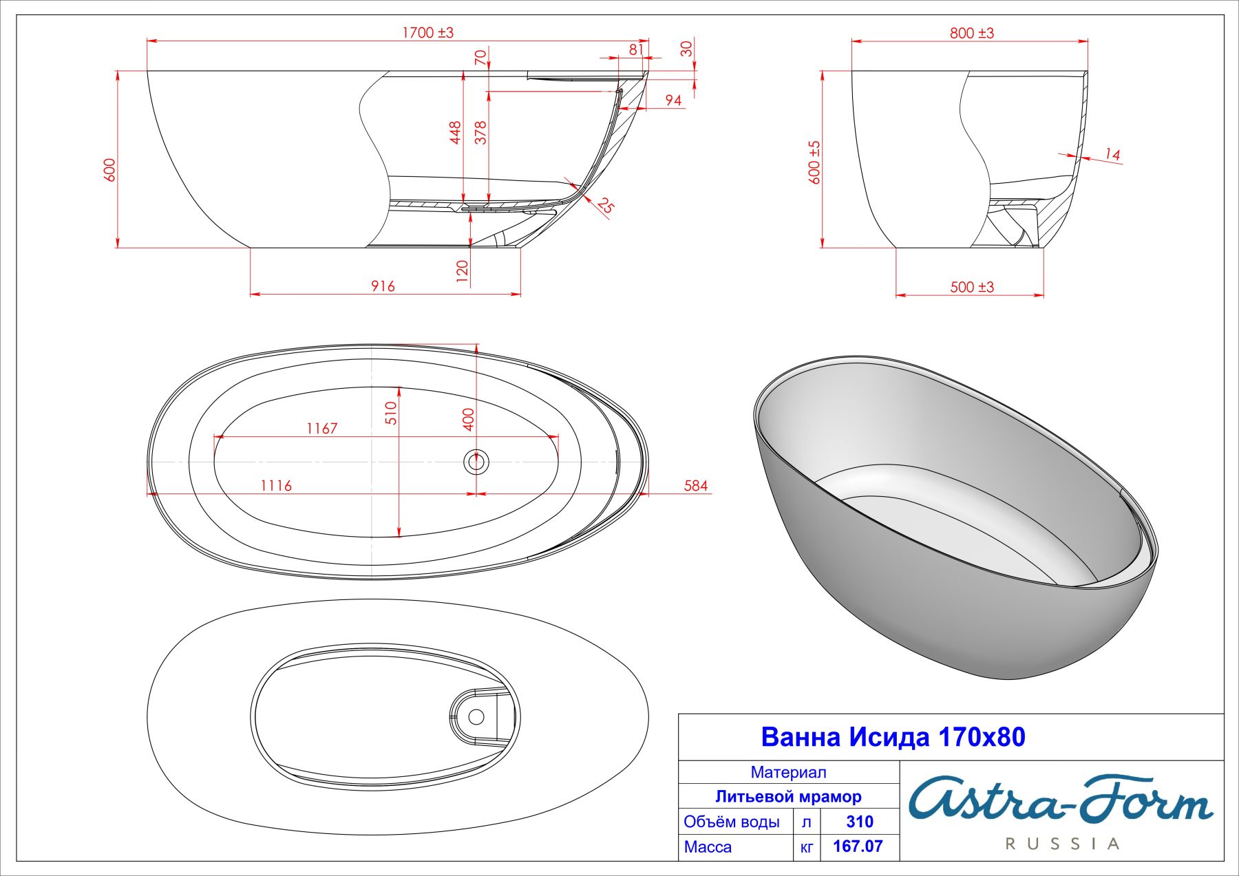Ванна из искусственного камня Astra-Form Исида 01010093 170x80 см с интегрированным переливом белый матовый купить
