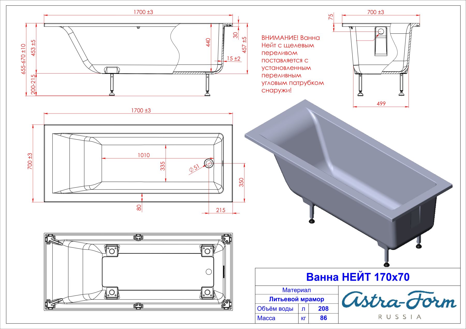 Ванна из искусственного камня Astra-Form Нейт 01010055+08010054 170x70 см с щелевым переливом донный клапан белый матовый купить