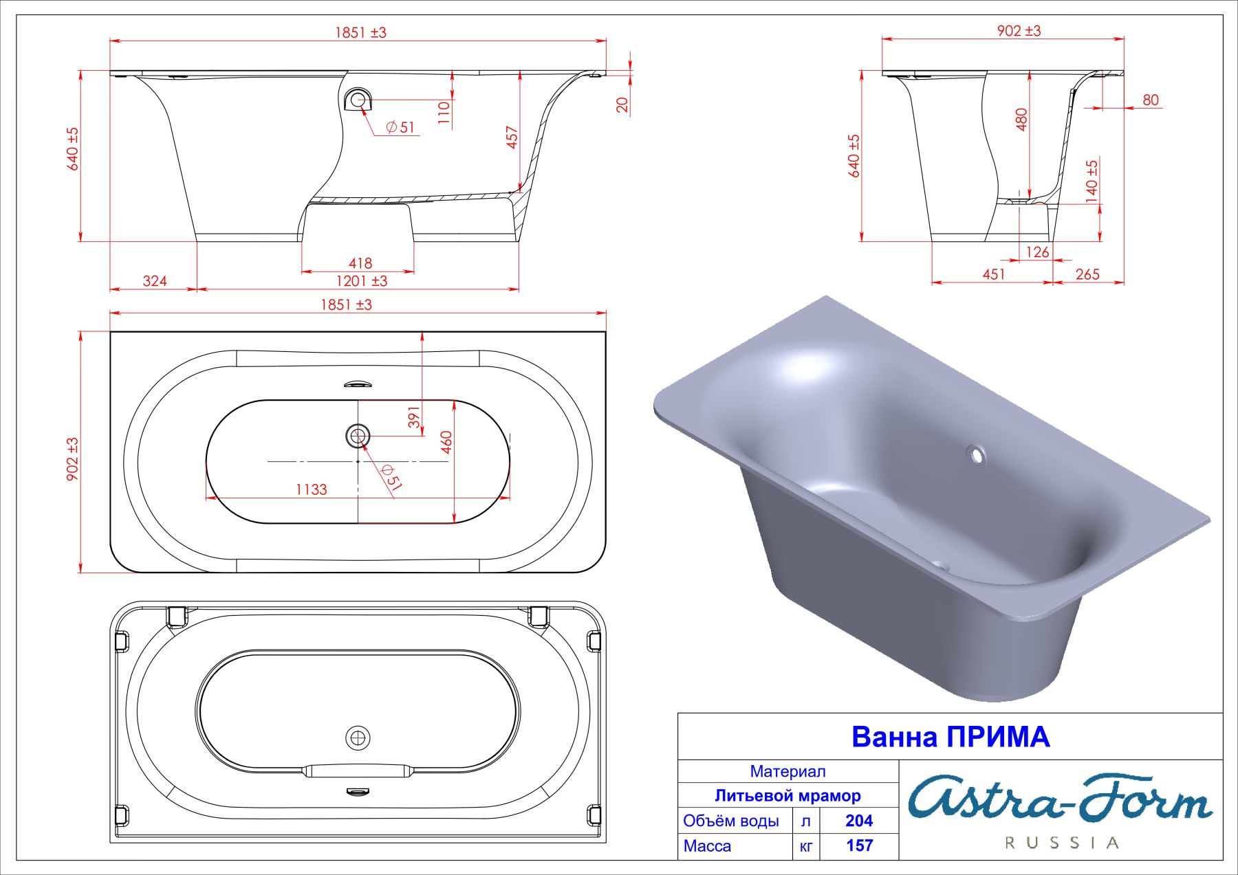 Ванна из искусственного камня Astra-Form Прима 01010079 185x90 см белый матовый