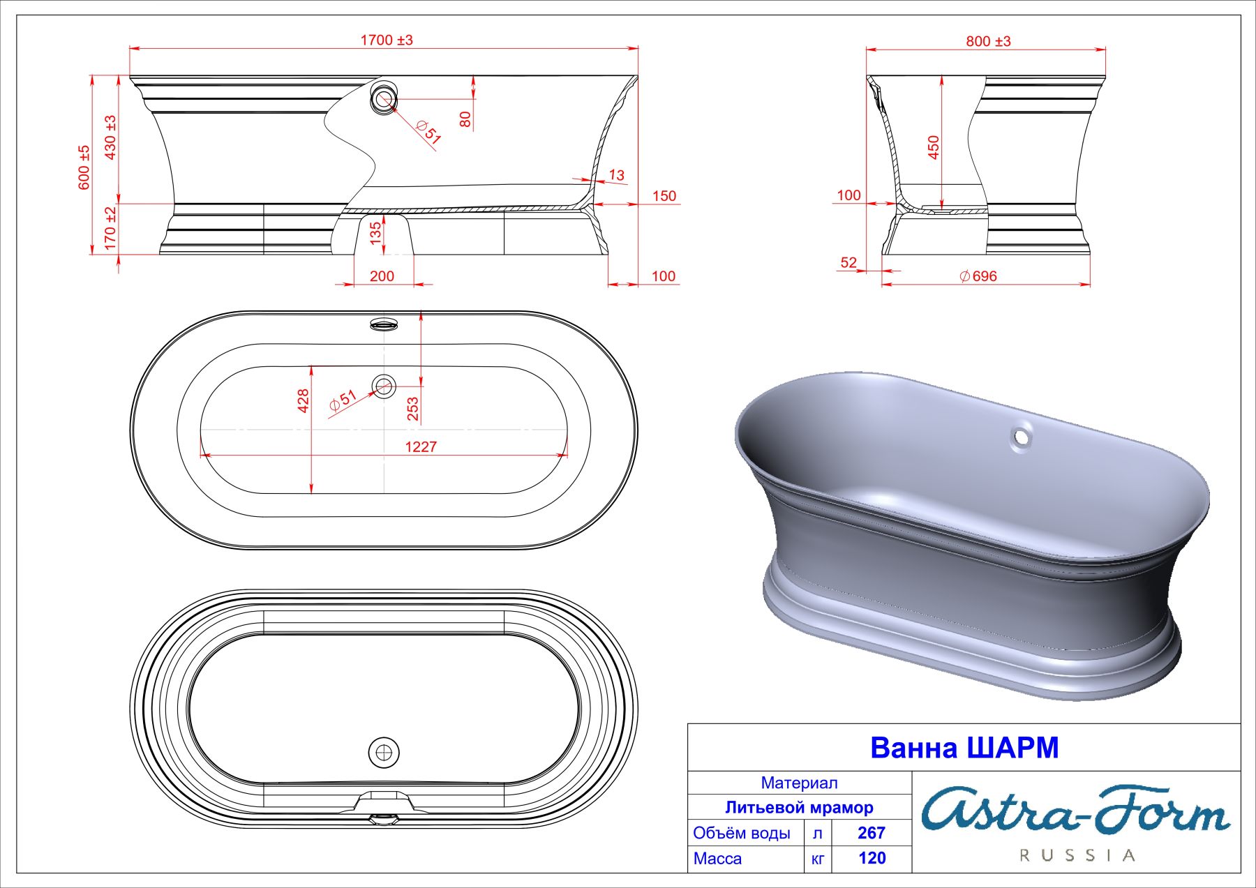 Ванна из искусственного камня Astra-Form Шарм 01010017 170x80 см белый глянец