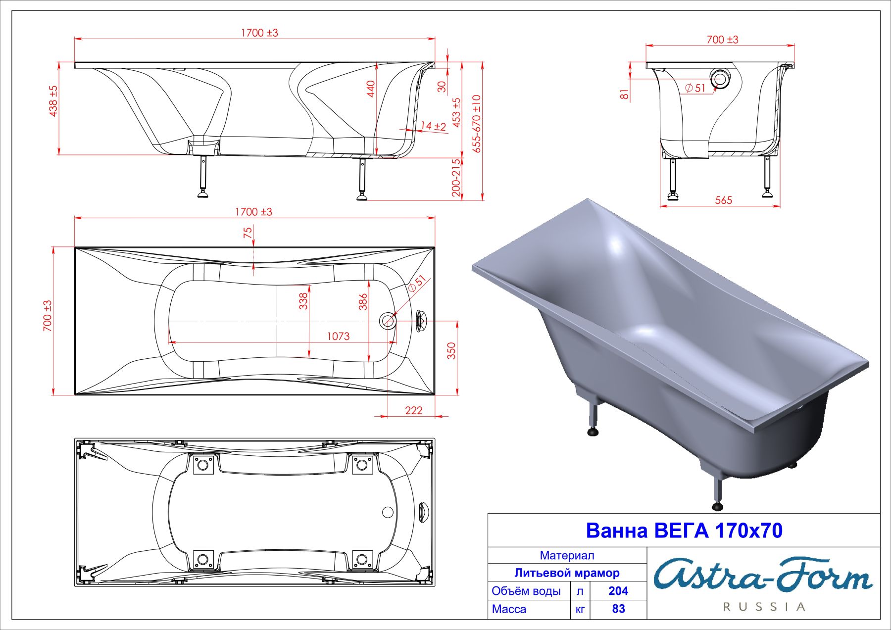 Ванна из искусственного камня Astra-Form Вега 01010002 170x70 см белый глянец купить
