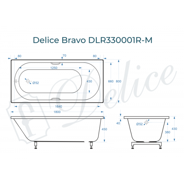 Ванна из литьевого мрамора Delice Bravo DLR330001R-M 180x80 матовая с ручками хром